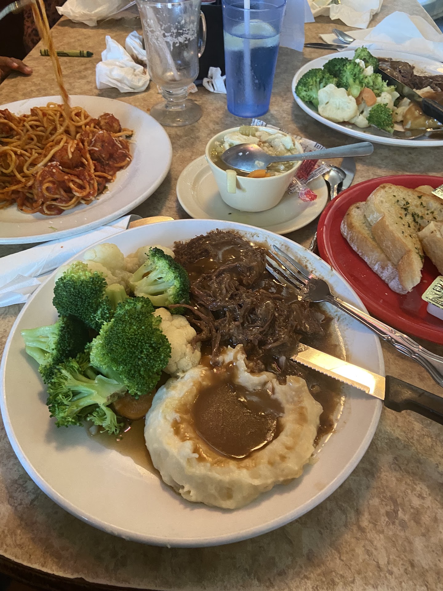 Cute eclectic lil spot….Service from our server was excellent! There was only two other tables seated when we arrived. Man who maybe was hostess didn’t make eye contact but not unpleasant. Collectively we ordered the kids waffle, one of the pancake combos, kid spaghetti and meatballs, and two orders of the yankee pot roast dinners. Waffle was well received by my 8yr old neice, my 10yr old neice enjoyed the pancake combo (said she preferred my homemade pancakes…I make them from the box), the spaghetti and meatballs was sub par according to my 5yr old spag n meatball connoisseur nephew (also says he prefers mine), the meatballs are definitely some kind of frozen meatball and the sauce not homemade. I got the yankee pot roast accompanied by mashed taters, gravy, steamed veggies, and garlic bread (had to ask for it, our server wasn’t sure if the meal came with bread or not and to be quite honest I’m pretty sure the bread we got was supposed to be for the sketti meatball meal..), pot roast was ok, very stringy, not a lot of flavor, probably not fresh. You’re basic diner pot roast. Mashed potatoes were box potatoes, so unbelievably watered down that when u mixed them together with the gravy it became a loose soupy mixture. Steamed veggies were the star of the show, exceptionally fresh! Garlic bread was just a couple of slices of maybe sourdough with generic butter and garlic salt, few sprinkles of parsley. Kids had the hot chocolate which was exceptionally tasty! Oh yeah almost forgot, got a chicken noodle soup with my meal, it was cool, nothing to write home about. Actually wish I would’ve just had a bowl of that and called it a night. Place was very clean and not busy at all. Saw another table enjoying some pretty good looking burgers on my way to the restroom which requires a numbered passcode to enter. Plenty of parking space of parking space at this place. Maybe I just went at a slow time. 6:00pm on a Thursday… I’ll be back again to have some breakfast, perhaps that will be a bit...