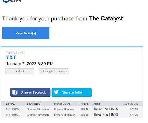 Read moreArrived at the venue @ approx 8:15pm ahead of the posted start time of 8:30pm per the instructions on the confirmation and email printed ticket. When we arrived, the band was already playing. When we entered the balcony area for the "Balcony Reserved" tickets I had purchased (at additional cost), I discovered that not only didn't I have a reserved seat, but there were NO SEATS AT ALL available in the balcony area, they were all filled. When I brought this to the attention of the security staff, they informed me that they don't know what happened and that we would have to leave the balcony area. He didnât even want look at the ticket I was trying to show him to prove I purchased 2 seats there. His only response was âYou need to leave right nowâ. In fact, nobody at the venue seemed to care that there were no seats available in the balcony. I was unable to locate a manager and nobody would even provide me with the name of the manager. My girlfriend (who just had knee surgery and needed to sit down) and I were relegated to standing at the rear of the venue near the entrance/exit as the floor was completely full by this time. Because of her condition, we were forced to leave after only a few songs. On the way out, I asked someone at the door what time the event started that evening and they said 8:00pm. When I tried to show them the start time of 8:30pm on the ticket, without even looking at it he said "call e-tix". Totally indifferent/incompetent staff at the Catalyst and incorrect showtime information provided by e-tix, which precipitated the whole mess in the...