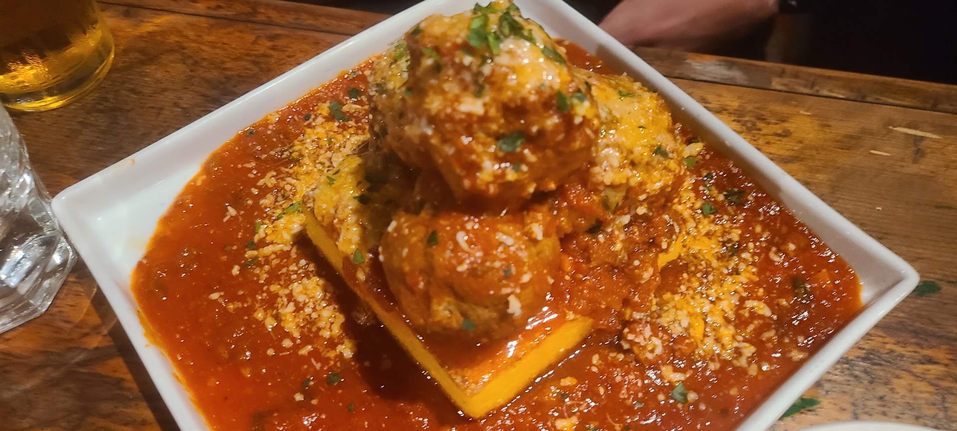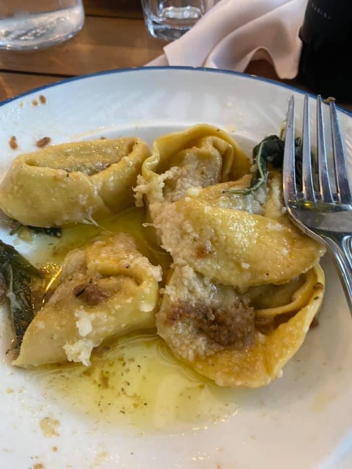 The menu sounded delicious, and despite the hand clapping 'cheerleader" group we ordered. I'm assuming the waitress couldn't hear our order because she totally missed the fifth person's selection. Now for the food. The Octopus special was delicious, cooked to perfection, beware the olives have pits. The short rib ravioli were plentiful, shapped to resemble wontons or tortellini, the pasta was tasty and perfectly cooked. The "ravioli" was swimming in butter with a sprig of sage. If there was Parmesan I couldn't see or taste it. The short rib filling was flavorful, but the texture of the was meat mushy as if it has been through the blender. The Penne alla Pescatora was a truly delicious. Perfectly cooked pasta in a light tomato sauce with tender seafood. The Beef Skewer Special (cooked medium well) was perfectly seasoned with a nice char. Unfortunately it arrived after everyone else had finished eating. The meat was lean and plentiful, sadly it was so tough it couldn't be chewed or even cut with the dinner knife. The artichoke side must have been brined, it was...