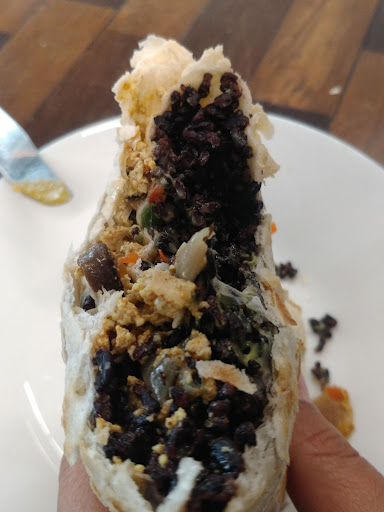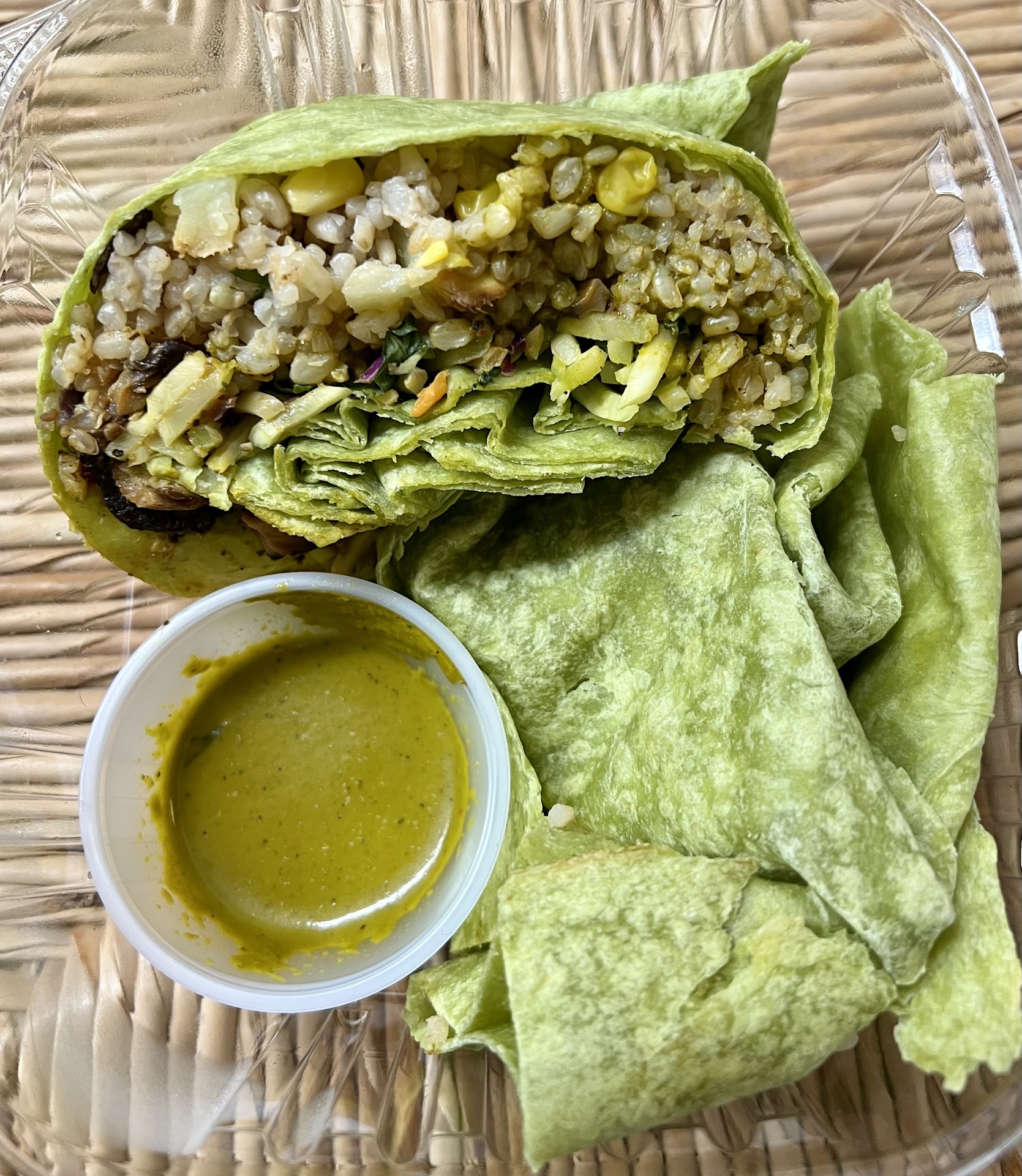 This felt like an extreme version of typical Veg on the Edge. Out of items. Mostly rice. $10.25 (not including tip and tax) per wrap. 45% spinach tortilla 45% rice 10% essence and color of other vegetables or protein