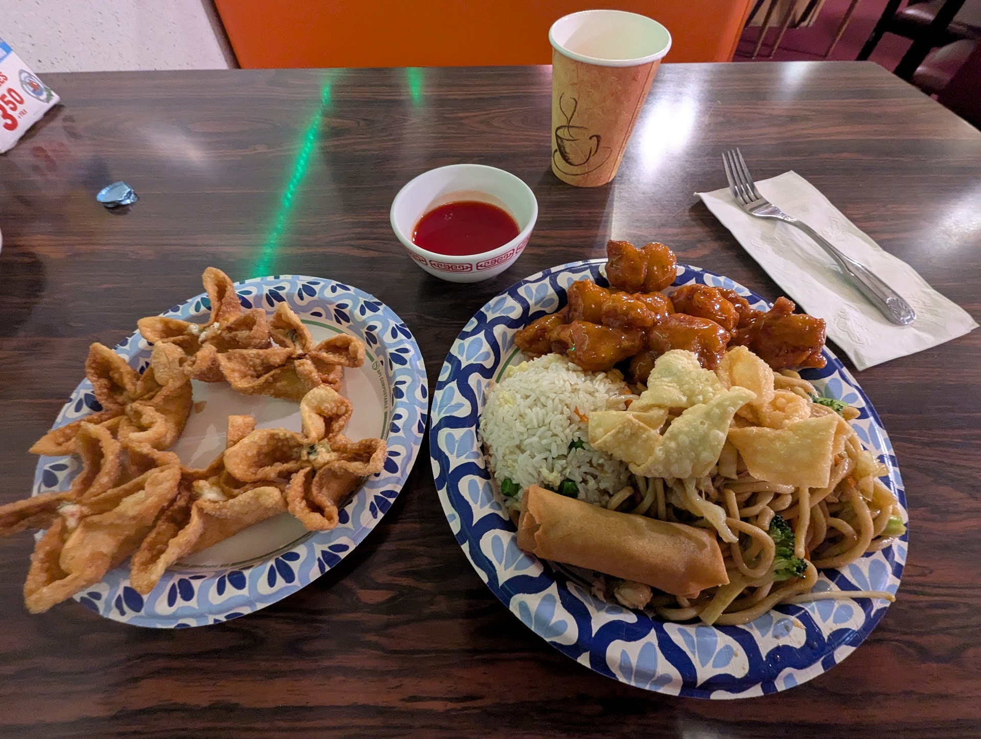 I ordered the orange chicken plate, a cup of hot tea, and—cream cheese wontons that were so crunchy and delicious.