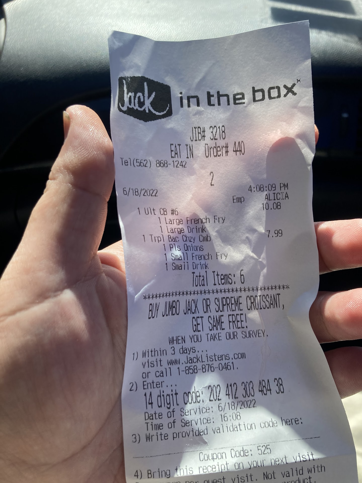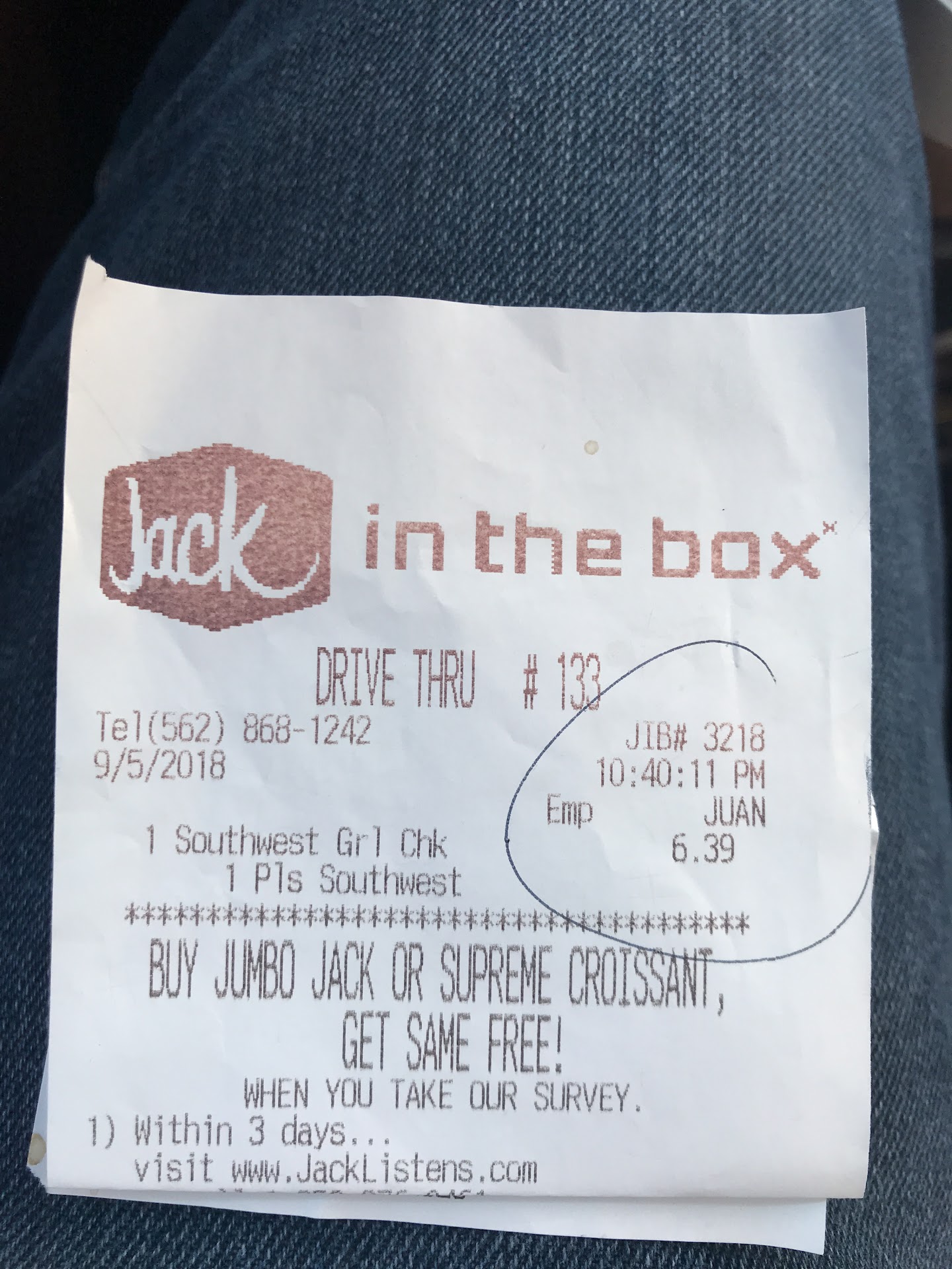 Read moreThis is probably the worse drive-thru experience I ever had with this specific jack in the box, this employee named JUAN took my order and guess what? After me driving home I find out that my southwest grill chicken salad it was under cook "WTH"!!! So I call right away to let this people know about so I can have my money back or get my order right, so I spoke with JUAN and he agreed and told me to come back at any time any day to claim my order and he will be giving me my order correctly and now that I am here Juan is not here and his co-worker Jeannette V. Called him over the phone and now he is saying that he doesn't k is anything about ! WIWWTP!!!! I showed them my receipt with drive thru # 133 and they are refusing to get me a new southwest grill chicken salad or to get...