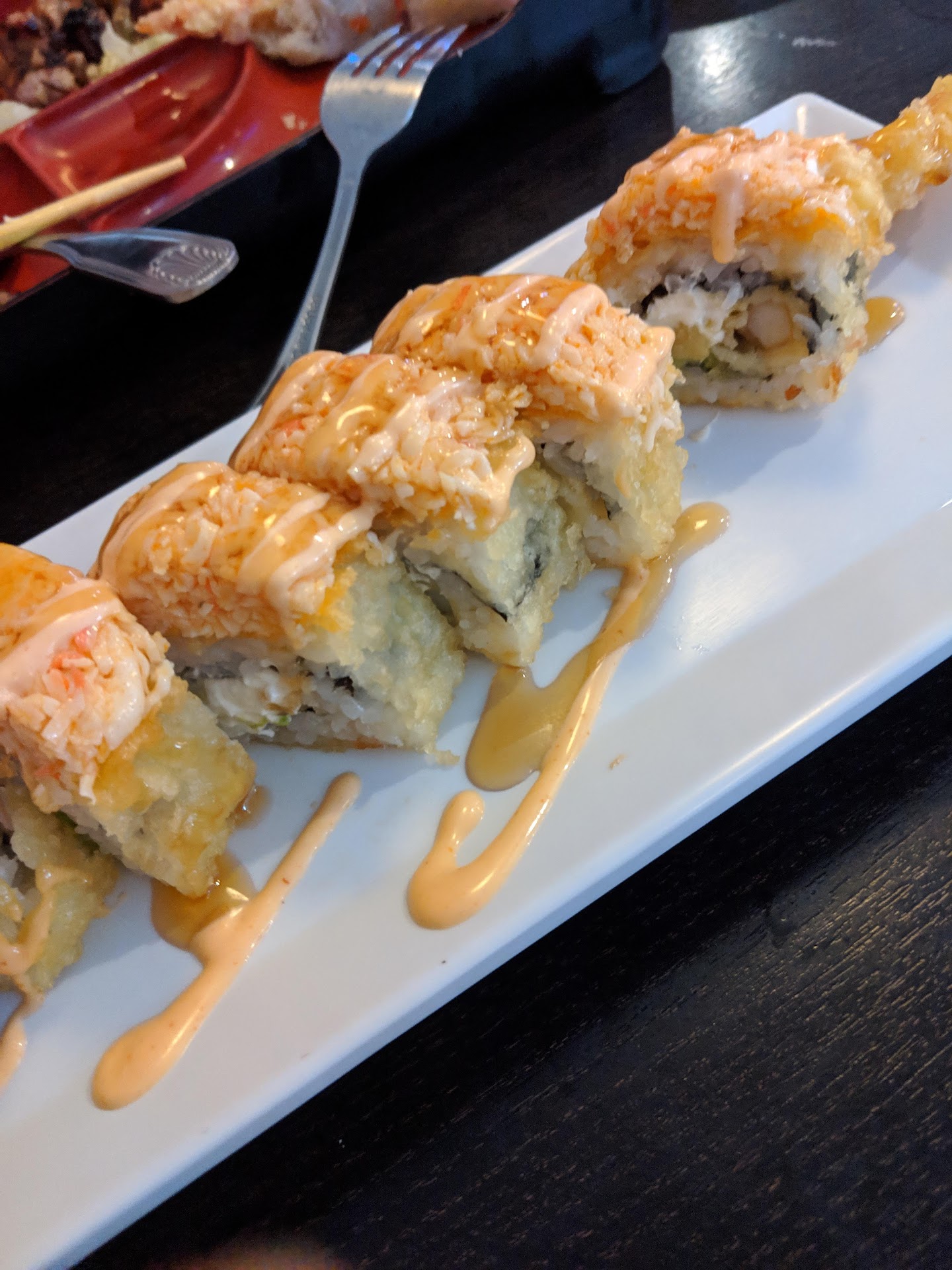 Read moreWhat the heck!!! This place is pretty much Narnia. From the outside you would think it's a small hole in the wall but once you step through the wardrobe you find your self in a pretty good size dining area with a drink corner and master counter of sushi chefs doing sushi stuff. We went with a teriyaki bento and some Sushi pieces to try stuff out without screwing ourselves financially in case it sucked. So......🤫 Come in closer....IT WAS FANTASTIC!! Now I'm not a sushi guru and I likeTo keep my opinion based on my level of sushi tasting skills. With that being said this will be my comparisons. This place makes maki yaki look like fast food ,take home grocery level compared to the quality you get here for pretty much the same price or even cheaper. Let me just say you can actually taste crab in the California rolls. Anywho, I went right when they opened and the staff was friendly and I mean friendly to the point you want to go wash your own dishes cause you feel bad. We will be going again tonight like little fatties. If the night time service sucks rest assure I'll...