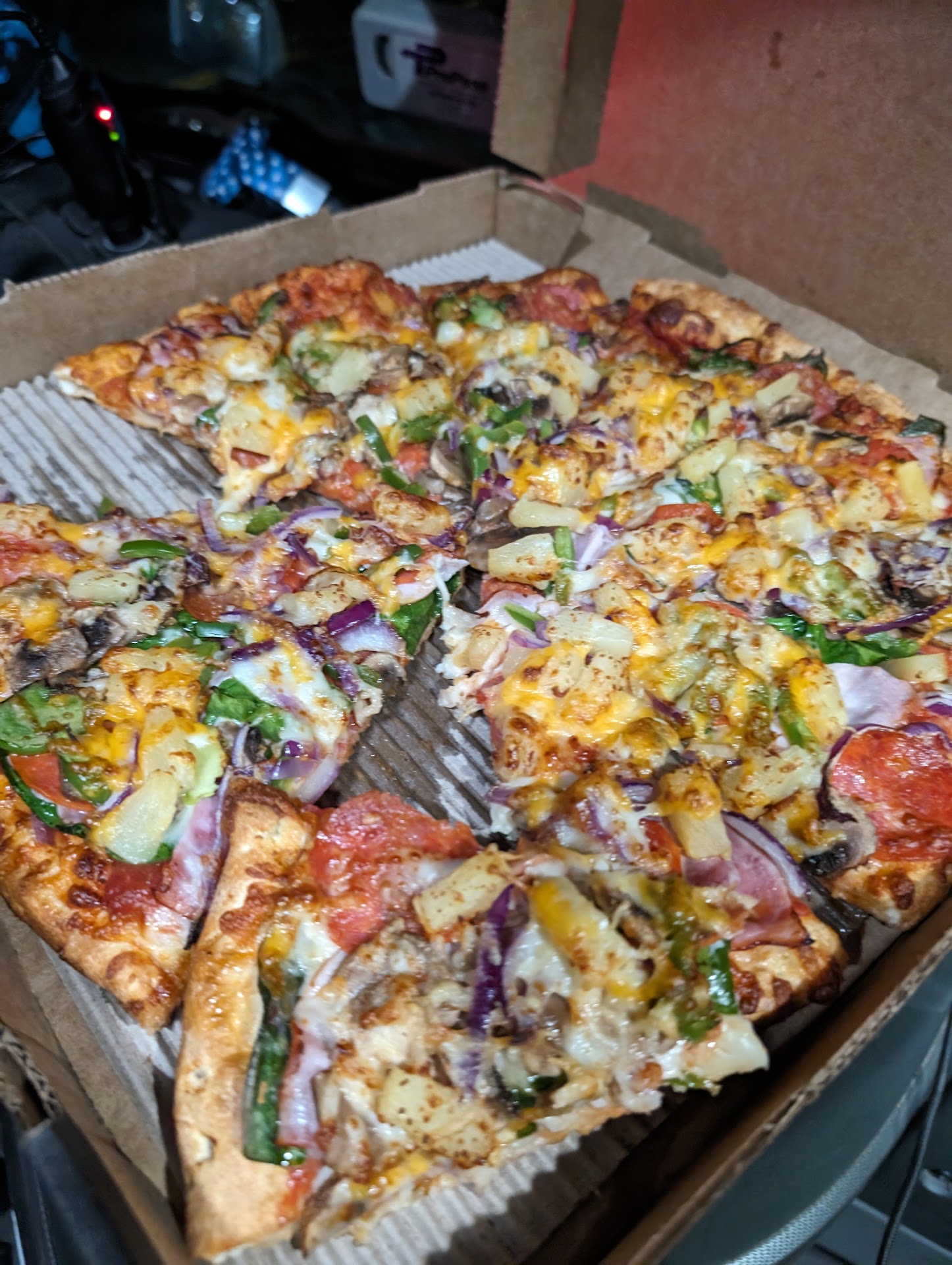Food: Full size pizza. Crispy, greasy, and flavorful. Just how a pizza should be.