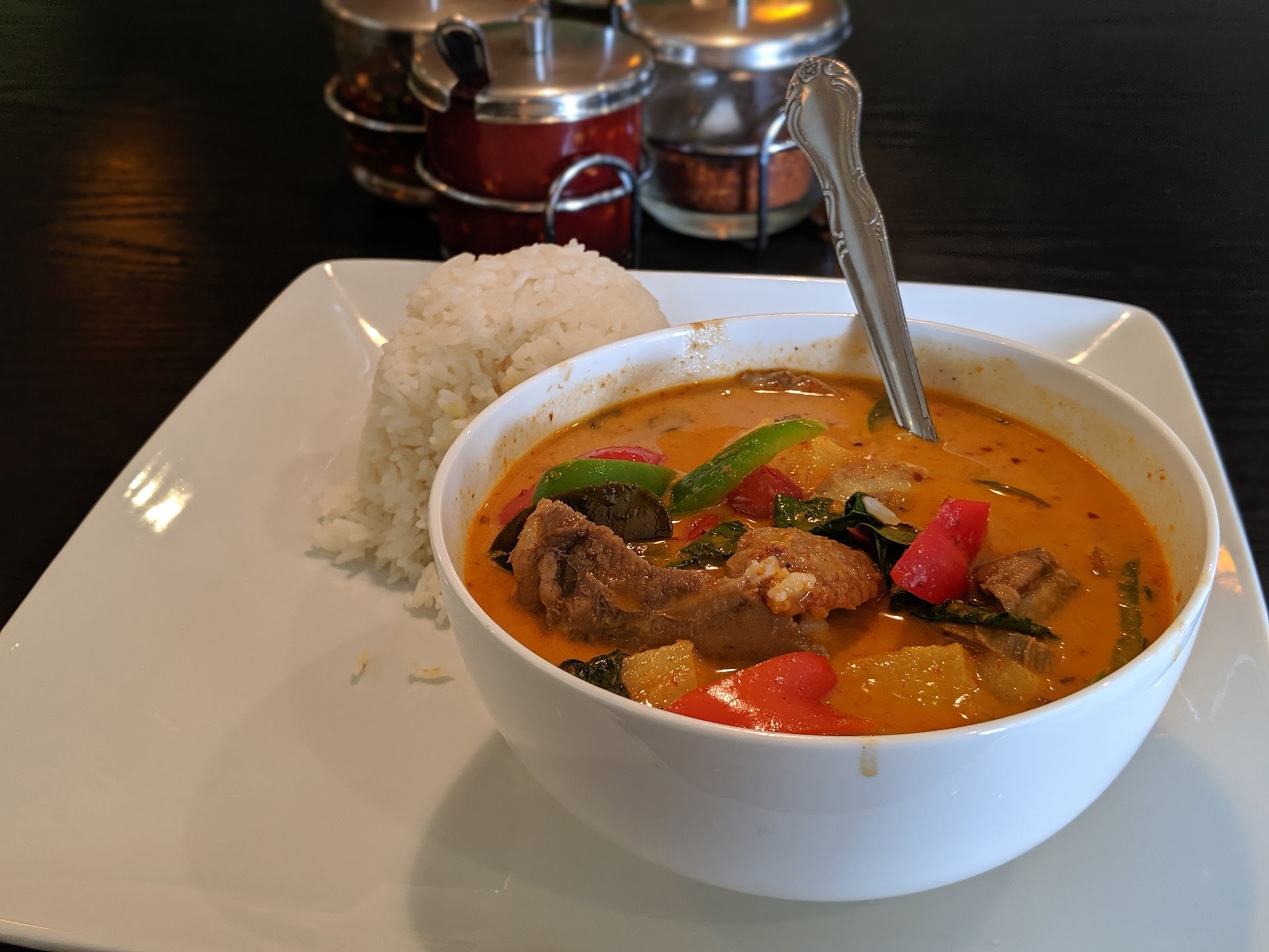 My order was the duck curry. Duck is fatty, and coconut milk used in curry is fatty, so I should have expected the heaviness that came with the dish. The spiciness is dependent on what you ask for, and they provide extra sauces to improve the heat of the dish if you need (I didn't!). The dish is full of flavor with mostly the ingredients you expect in a curry dish (thankfully no mushrooms, snow peas, baby corn, broccoli or asparagus). An ample serving of rice helps you take in all of the goodness in that curry without feeling like you will run out of one before the other. Overall, the dish was very good, even if it was a little heavier than I had thought. I will probably order massamun or green curry when I return, if in the mood for curry.