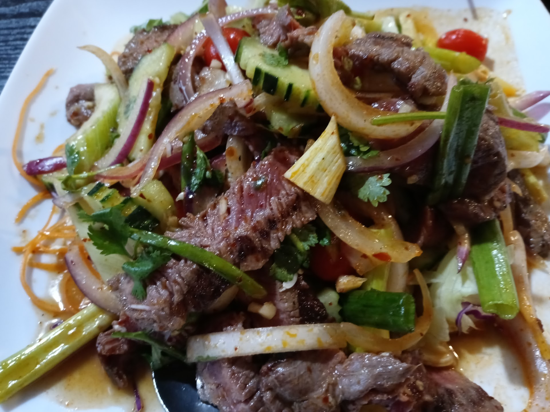 Read moreThe food here is super fresh an delicious I order mild cause it can be pretty spicy. We Love! their Spicy beef salad it has plenty of steak,romaine lettuce,red onion, cilantro, tomatoe, cucumber etc. The chicken/ beef satay with sweet an spicy peanut dipping sauce is really tender and tasty. You get a small side of cucumber relish which my David usually claims..lol. it comes with the order. Do try the beef,chicken, an shrimp rice so good an plenty to take home for lunch the next day. This place is a hidden Gem in a little spot next to a old liquor store but it is really worth trying enjoy David an Helen...