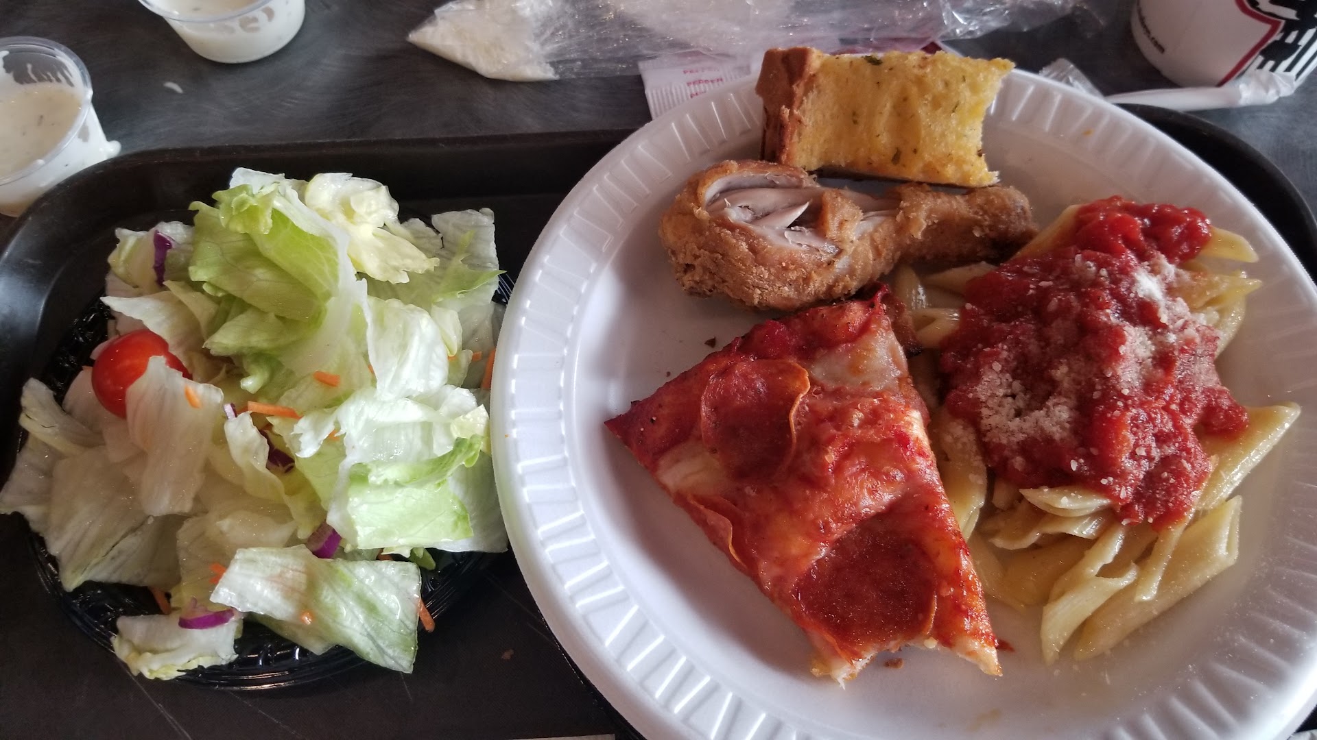 The food? Perfect. Everything we ordered was hot, fresh, and full of flavor. The pizza was delicious, and the salad was honestly one of the best I’ve had at any place like this—crisp, fresh, and well-stocked with toppings. You can tell they care about quality here, not just cutting corners.