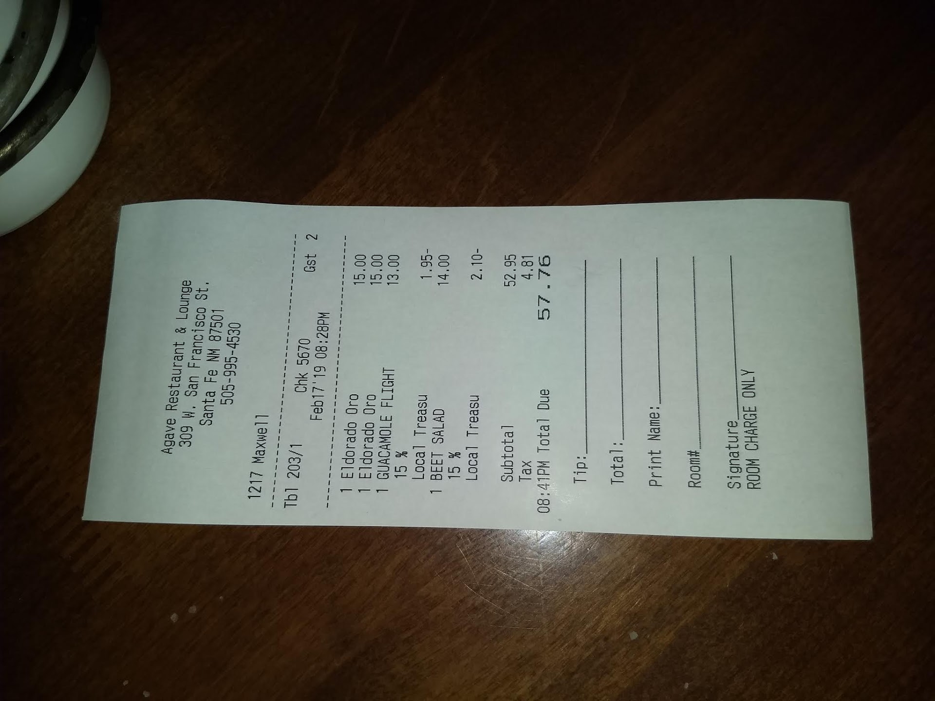 First of all, Sunday Feb 17 2019, 8pm, the place was empty. We were sat quickly and offered menus equally quickly. We ordered two fancy margueritas (see bill), a beet salad and guacamole to share. And then it went downhill.