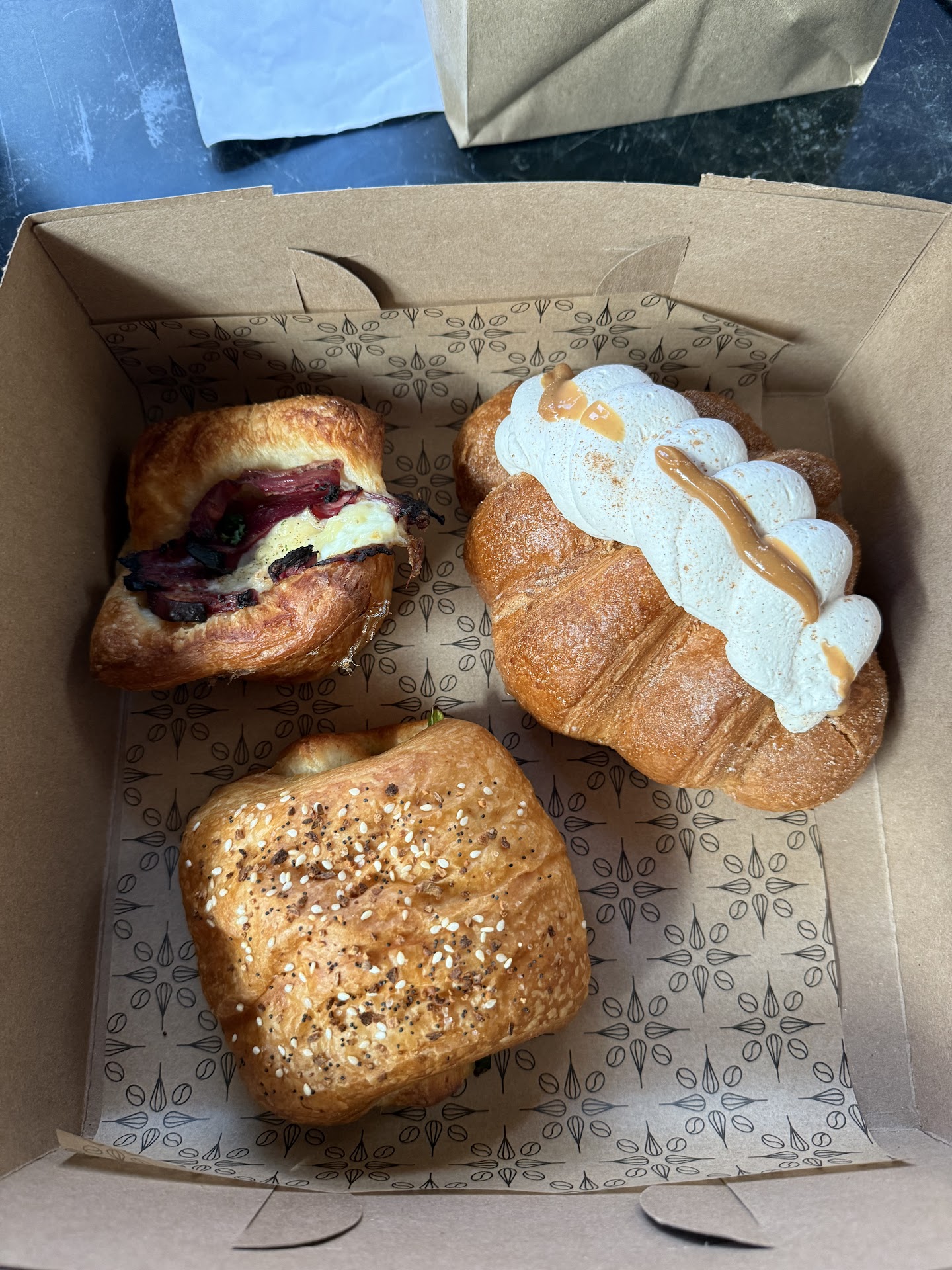 We were blown away by how beautiful and delicious everything was! It was such a small, unassuming building but beautifully renovated with a glass-enclosed kitchen so you can see them working throughout the day. Their website does say that items are only available until they sell out, so you should definitely get there early if you can. If I had to pick our top four favorites, I'd choose the "everything" croissant with cream cheese and green chile filling, the churro croissant (as big as my face!), the boar bacon and gruyere croissant, and the key lime bar — but honestly, there wasn't a single bad item in our entire (large) order. The peach jam that we wanted to try was sold out and when we asked when they might get more, the owner said the peaches were being delivered the next day at noon and she would need a couple hours to make the jam — so that gives you an idea of how fresh and local this stuff is! Later that day, we stopped by another Santa Fe business where an employee asked where we had visited so far and when we mentioned Baked and Brew, her eyes lit up and she asked, "DID YOU TRY THE CROISSANTS?!" So, the locals definitely know how...