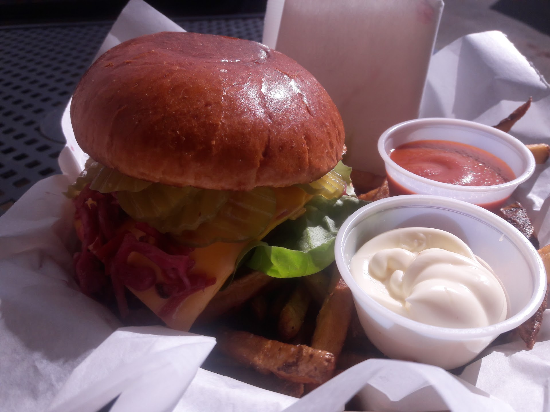 The food came and my paper thin chicken sandwich was fried to the point of being completely dry. The house made ketchup just tasted like pureed canned tomatoes with some 3 year old spices thrown in.