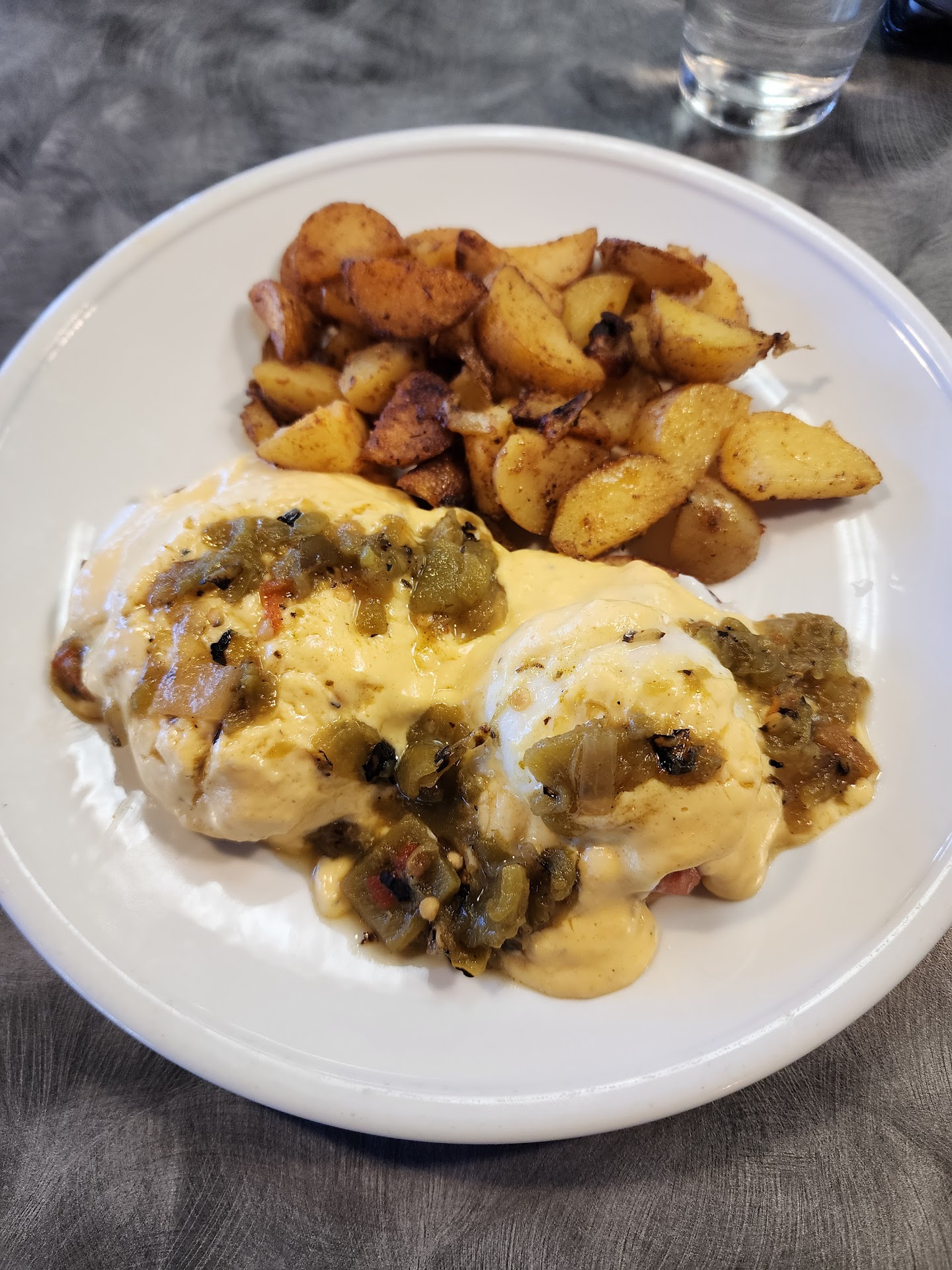 The green chile hollandaise sauce was geletonous and had green chile on top, but seemingly lacked any in the chile sauce itself and wasn't anything I'd try again. Last, there was hardly any chorizo at all. There was "some" so it wasn't forgotten, but it was maybe a teaspoon's worth across two muffins. The good thing that happened with this breakfast is 1.) There was ample Cholula hot sauce brought to the counter I was eating at, and 2.) The soft-poached egg is the one I had last. These two things combined and mixed made eating the unremarkable pappas/home fries edible.