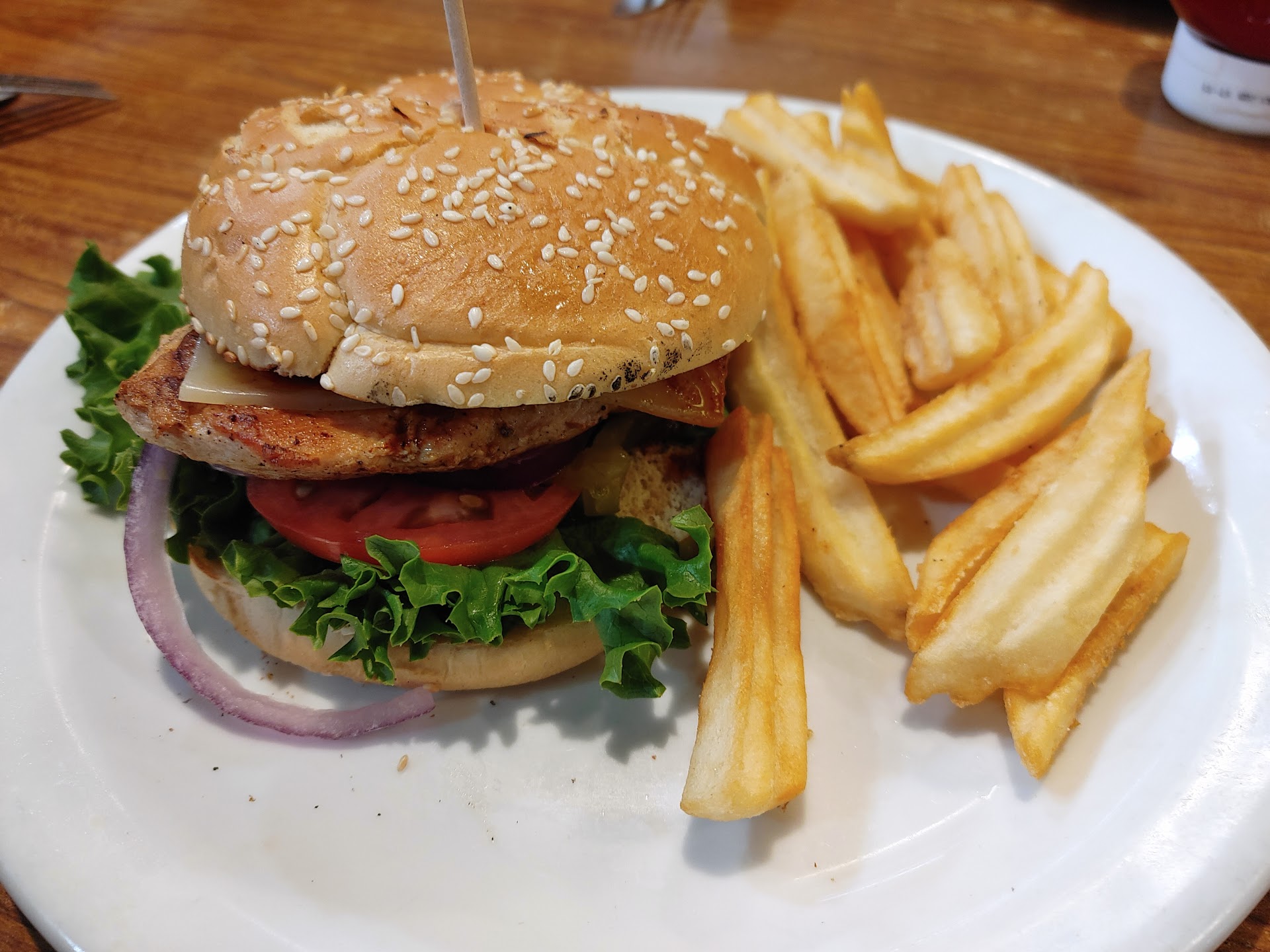 Now, I'll say that my special order burger with a chicken breast instead of beef was actually pretty good. It was made right and hot, and the fries were fresh and seasoned well. Everyone else's dinner orders were a bit of a mess. One dining companion got the Chik 'n' Honey sandwich and said it was bland and over saturated with sauce. Diner the third ordered an appetizer sampler got the wrong items on the plate. She was able to get one item subbed out with no issue but the fries that should have been on the platter were still missing.