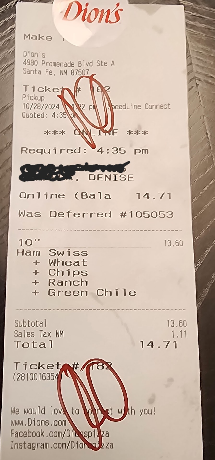 Read moreThe Pizza is hands down the worst pizza I have ever had, 1 star, and pricey too. Suffers just as bad as Domino's old cardboard crust issue they used to have. Not only is it cardboard, but also spotty with sogginess. The veggie pizza also needed lots of flavor, tasting super bland, and even the green Chile tasted like it needed garlic and salt as if not seasoned at all.