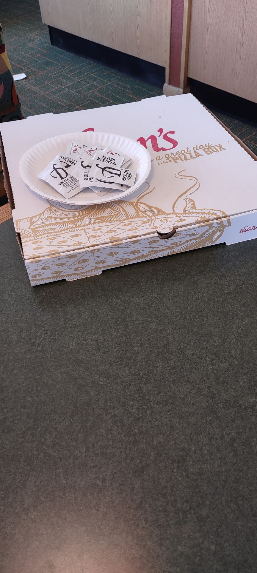 Read moreCome on guys. As I kid, I used to bus tables, cook, etc. The dining room area was dirty, almost every table. Had to mention to the front counter to clean tables; and the work area was brimming with idle employees! THEN, when they come out to clean. NO HOT WATER/SANITIZING BUCKET! Even in the 80's or 90's without COVID we took sanitizing water to keep the cloth HOT! SORRY, fail by management and staff, plus the health department should be notified! How/when do/will this next generation of children get self motivated enough to think ahead and properly consider courtesy: it is something we all would like; especially on the road with all these new same/drivers and teens acting the same way! Lastly I'm still waiting on salads 15 minutes after the pizza is ready, and we just wanted the pizza to go....