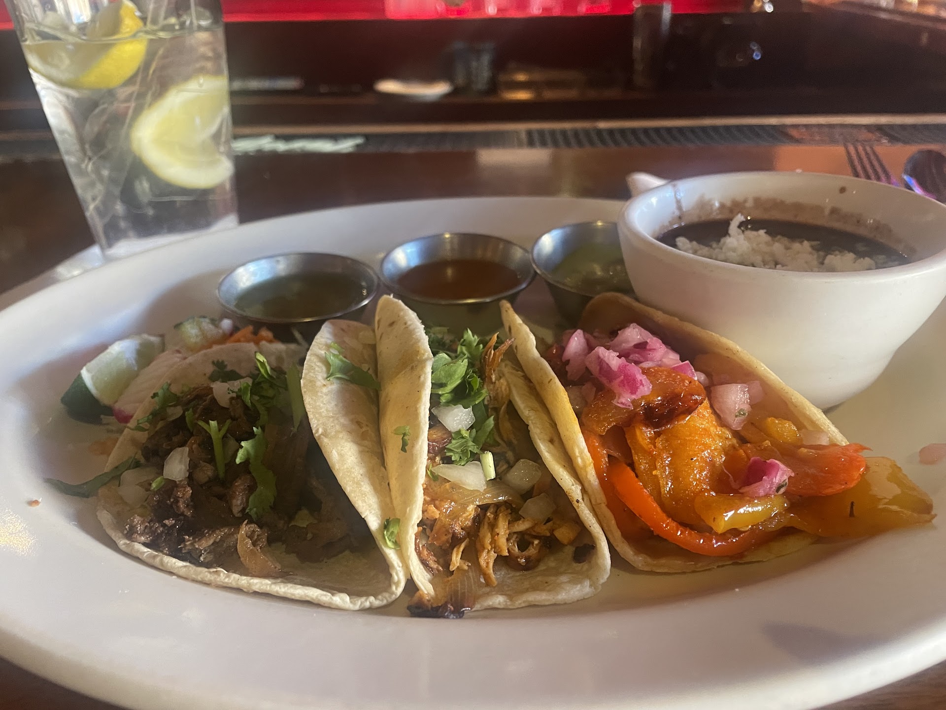 I order the flight of tacos : 3 tacos of my choice, a side of black beans and a small helping of slaw. (The corn tortillas are house made!)