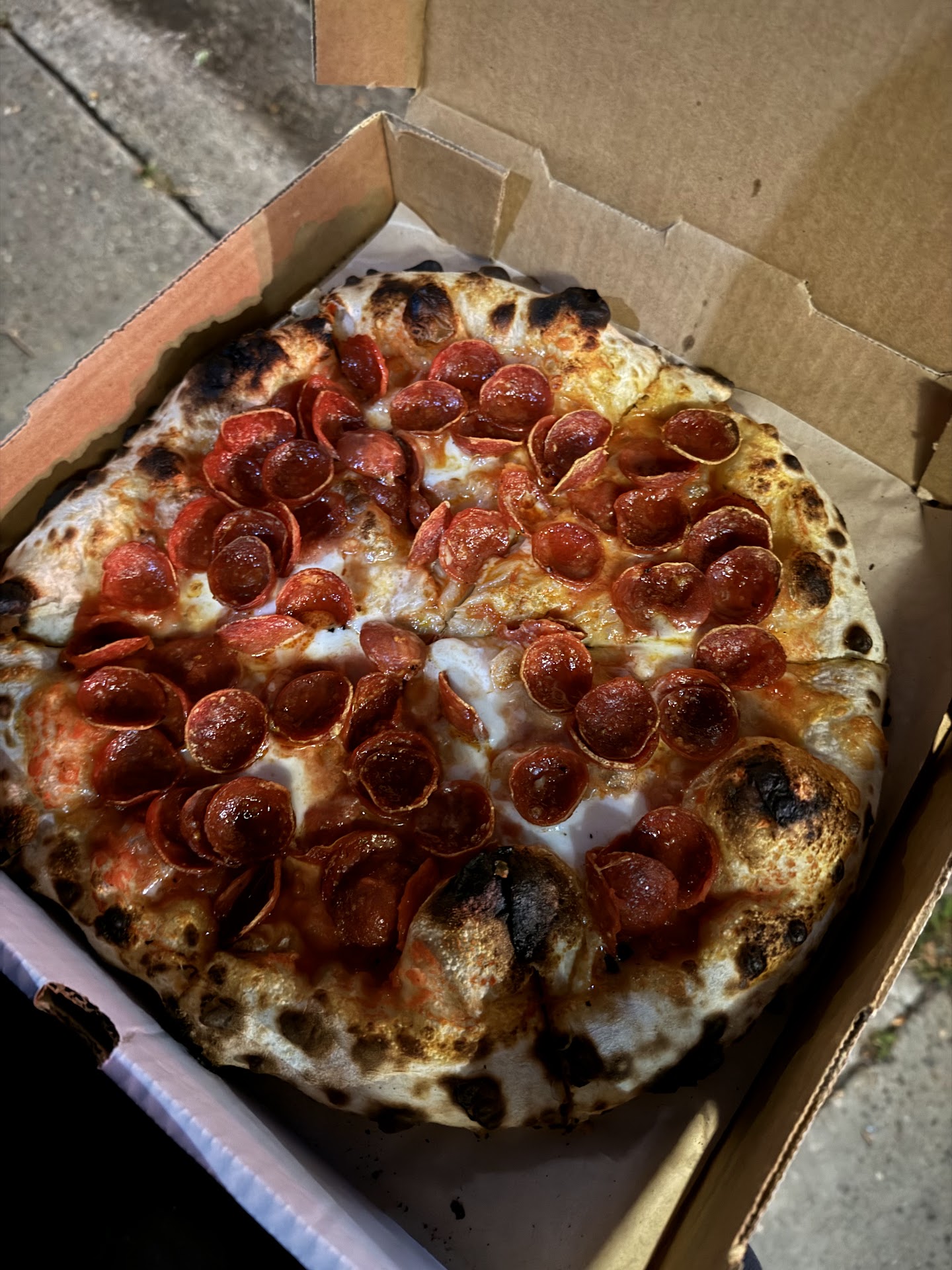 Small gripes up front, Now for the good. It is wonderfully tasty. They have all sorts of eccentric toppings and are the only pizza place I’ve ever found (outside of my own kitchen) that has blue cheese. Pepperoni and blue cheese, I highly recommend it. They claim their mozz is made in house and its delicious flavor gives me little reason to doubt said claim. Their pepperoni’s are top notch, likely sliced in house as well given their flavor and casing (notice the cupping, usually only found in whole stick peps). My mother’s pizza was equally wonderful with its specialty Italian sausage, hot honey and basil.