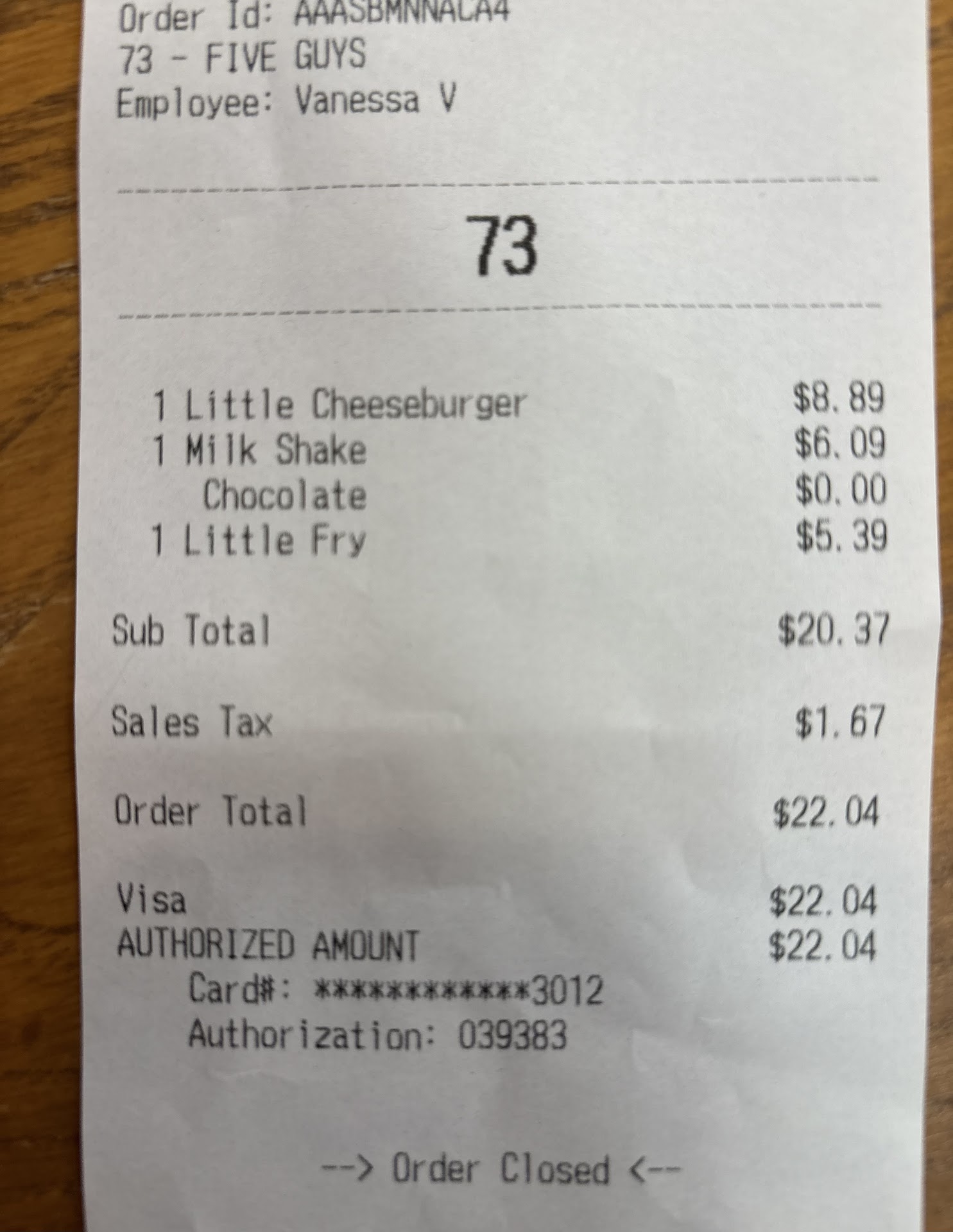 Read moreI'm an employee with this five guys.... I was harassed and threatened by a corporate manager, in front of my store manager, Sarah Surna, and my assistant store manager Jose Garcia. I'm schedule 4-midnight every night, and they threaten my employment if I don't stay late until 1 to 3 am.