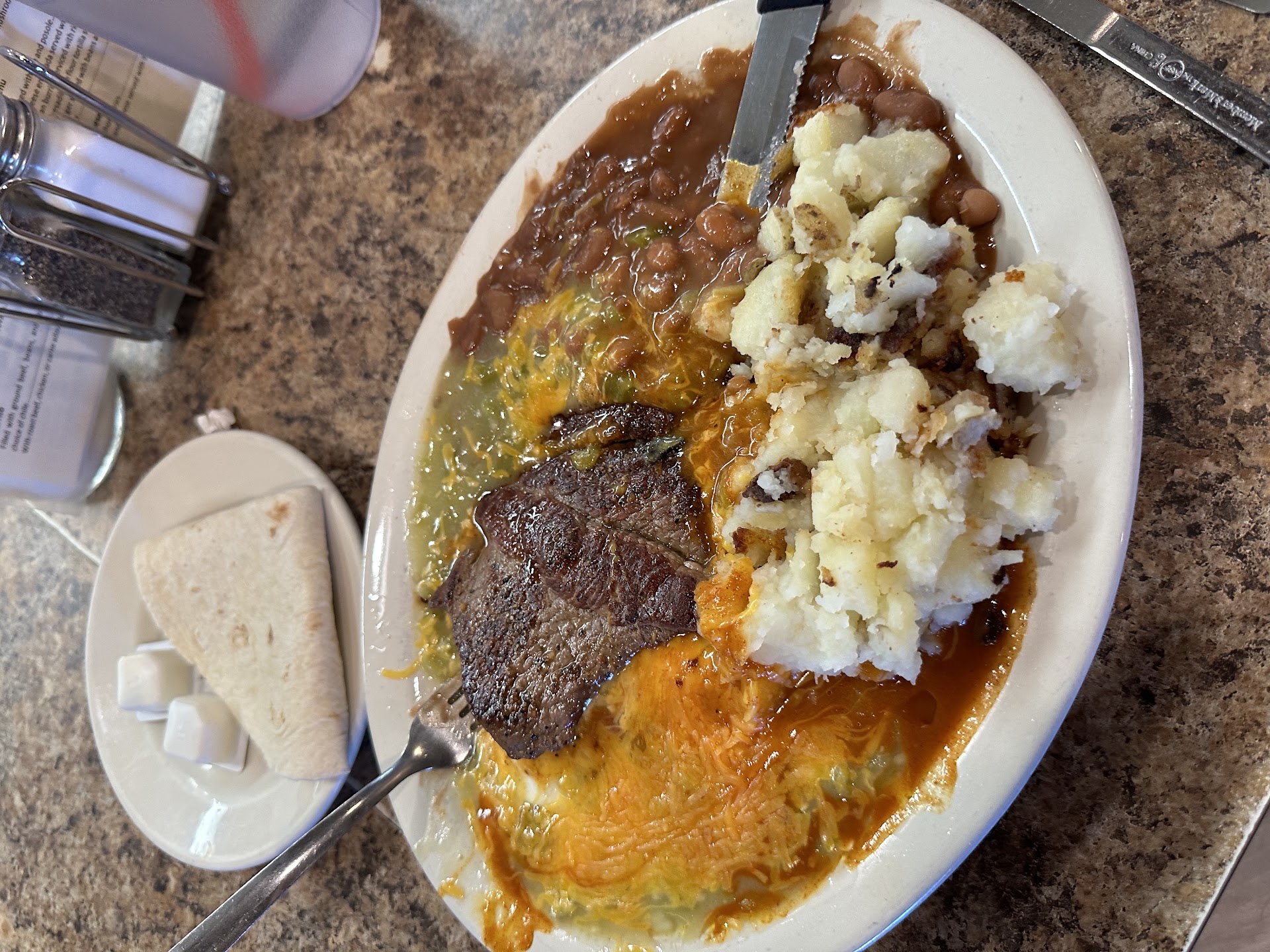 I ordered the roast beef enchilada plate and was underwhelmed! They put the wimpy gringo chile on it, (green and red) and as it wasn't terrible tasting is wasn't great either. Pretty bland. The "roast beef that I had to pay extra for was cheap processed pressed meat and not real roast beef! I should have got the ground beef. The posole was gross and the rice was , well, meh. The whole beans were ok. The cheese looked like processed Velveeta.