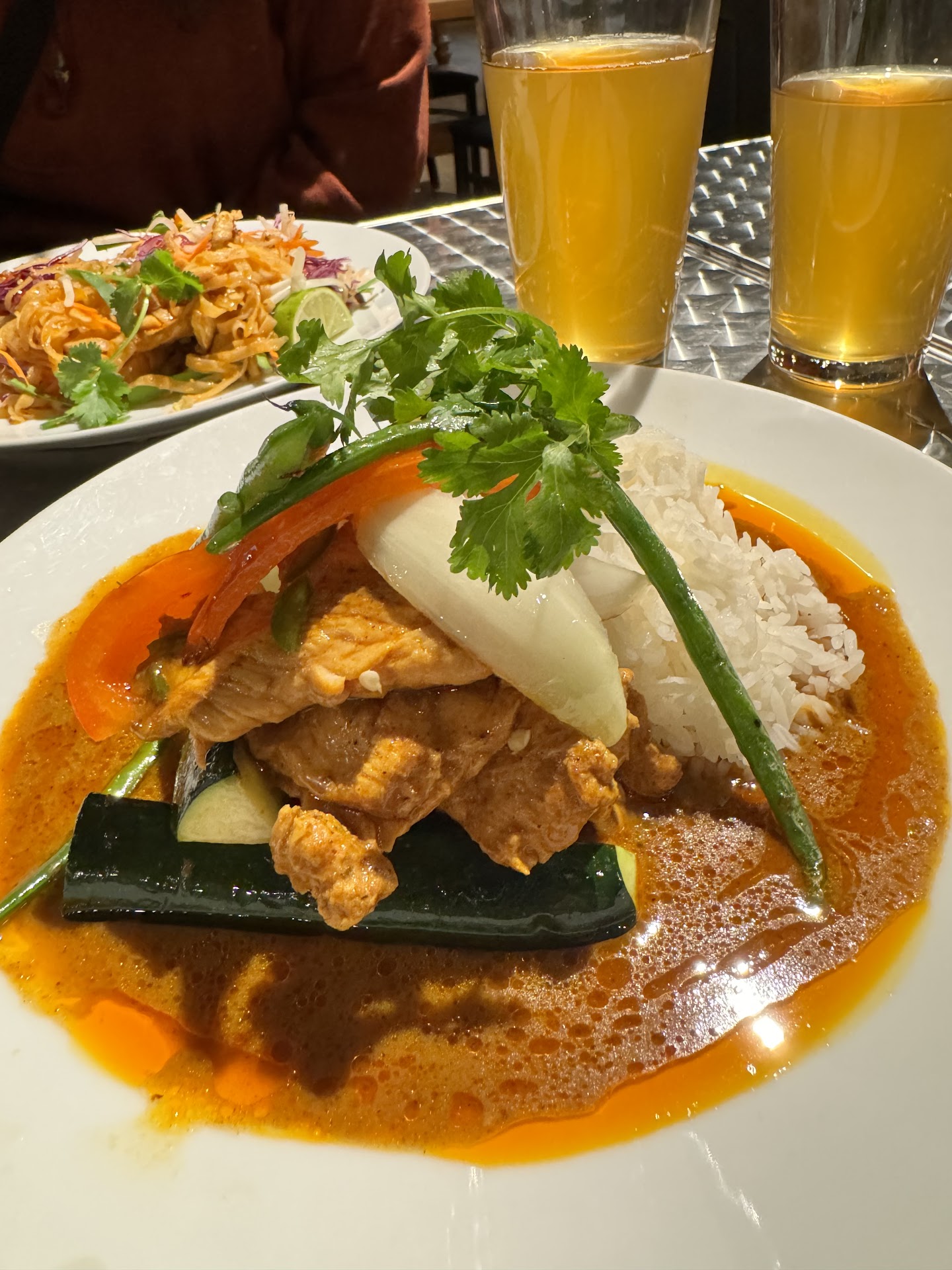 I never leave negative reviews, but am making an exception here. We went to this place having read the mostly favourable reviews and REALLY wanting to like it. The positives: It's located inside a very relaxed, dog-friendly, and kind of cool food hall. The negatives: We came at 7 PM. We waited for our two dishes (vegan pad thai and green curry) for a full hour. We kept being told that it would just take "another 10 minutes". At one point, I was asked to repeat my order. Meanwhile, a woman who ordered food 30 minutes after us got her food before we did. The green curry: The paste was extremely delicious and had layers of sophisticated flavour. The vegetables, however, were undercooked (compared to Thai standards, not some arbitrary standard of mine), I assume because they were rushing to get the dish done. The pad thai was decent, but, honestly, not worth the steep price. The vegan pad thai was cooked on the same griddle as some chicken, and it tasted like chicken in places. The presentation of all the dishes that they make, however, is visually very pleasing. When I returned the plates, the owner asked me for feedback. I said that, unfortunately, the vegetables were barely cooked and my vegan pad thai tasted like chicken. Her response was to simply say that this wasn't true. To sum up, this is an overpriced place. It is slow and extremely disorganized. The food is not bad, but it is evidently not consistently good. The stand calls itself vegan-friendly, but uses the same griddle for all the dishes and does not clean it between dishes (I watched my food being cooked). I would never...