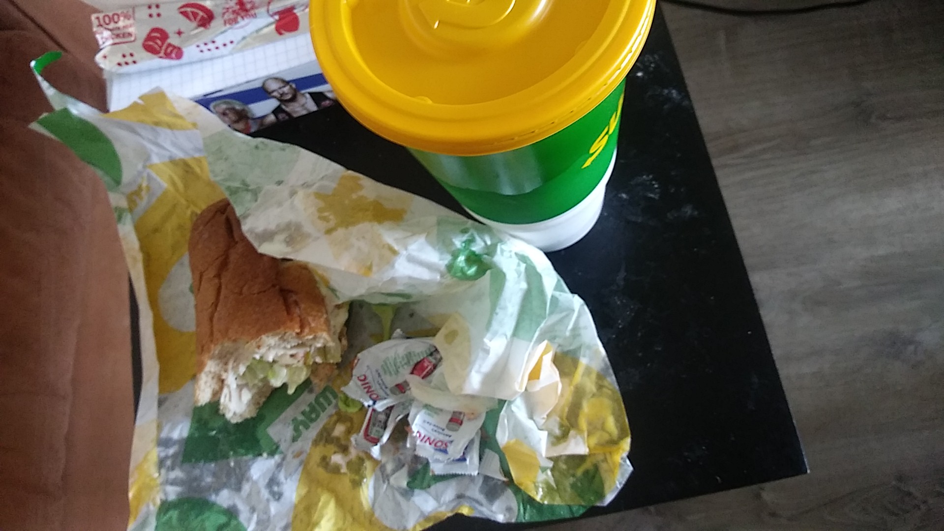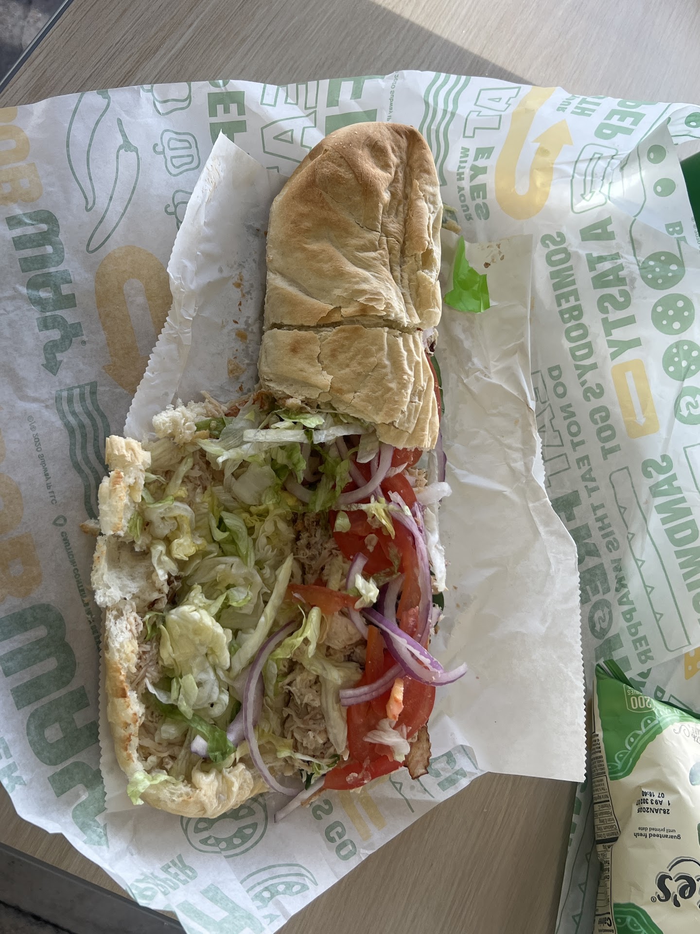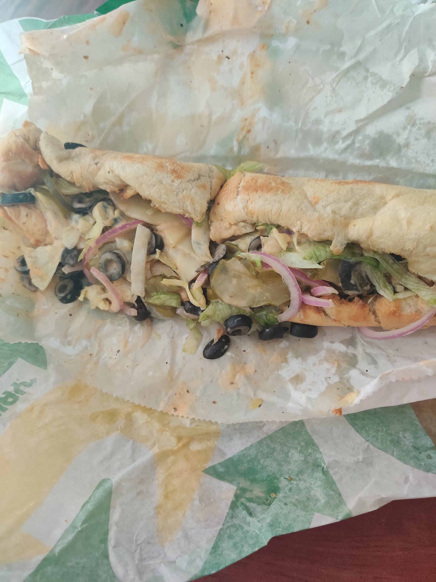 Read moreVery disappointing lunch today. Two employees with a line of eight customers, my husband and I were at the front of the line. Took about total 20 min from when we entered the store to when we left. Employees looked uncomfortable, inexperienced and overwhelmed. Most of the ingredient bins were either dirty or empty, which extended the time to make our orders due to the employees going back and forth for what was missing. I do appreciate one employee was apologizing for being under prepared. We took home one footlong flatbread turkey and ham which came out some what decent, however as for my husbands footlong teriyaki was a complete mess (picture posted along). While the employee was making my husbands sandwich, they had forgotten to add the cheese. At the end we were confused when one employee started going through all the cabinets and had sent their coworker to the back to look for something, afterwards they they told us they ran out of footlong wrapping paper so the sandwich has to be wrapped in two six in. papers together and that "hopefully" it holds together. It appears to be obvious management didn't train properly or they flat...