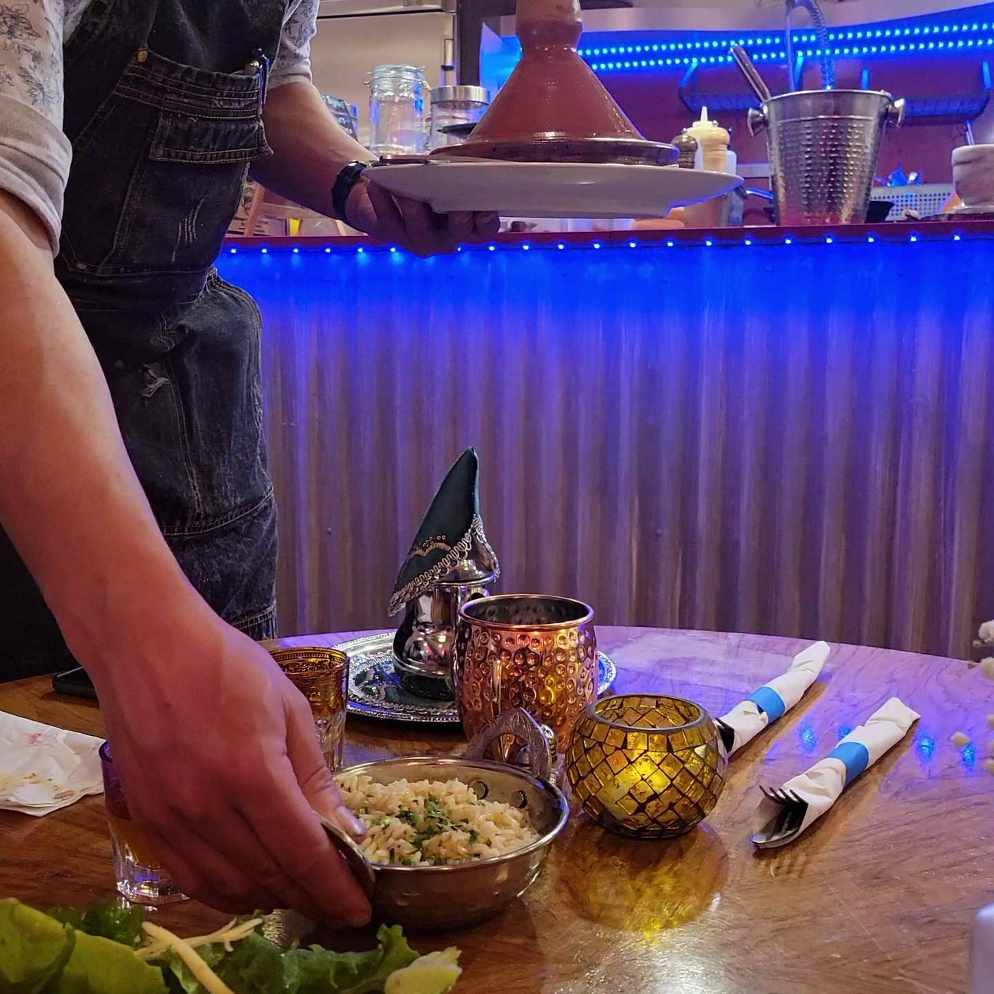 Read moreThe atmosphere in the small restaurant is nice. There's not much space and some tables have very low seating, we were lucky to get one at normal height. The food tasted good, it's not the "classic Moroccan restaurant tajine" with meat, couscous etc. That could be a bad or good thing depending on your preference. Staff was very friendly. The reason for the "meh" rating is that the portion size was VERY small. We had the tajine for two which was advertised as a main course and I - a woman of average appetite - was very glad I still had some cereal bars in the car because I was still hungry. The portion size would have been adequate for one person and the price was $27 (for two) for the vegetarian dish. If we were talking about exotic ingredients that are difficult and expensive to source in the US that might be reasonable but it was mainly things like green peppers, zucchini, peas, carrots, quinoa and pita bread - pretty cheap stuff.
