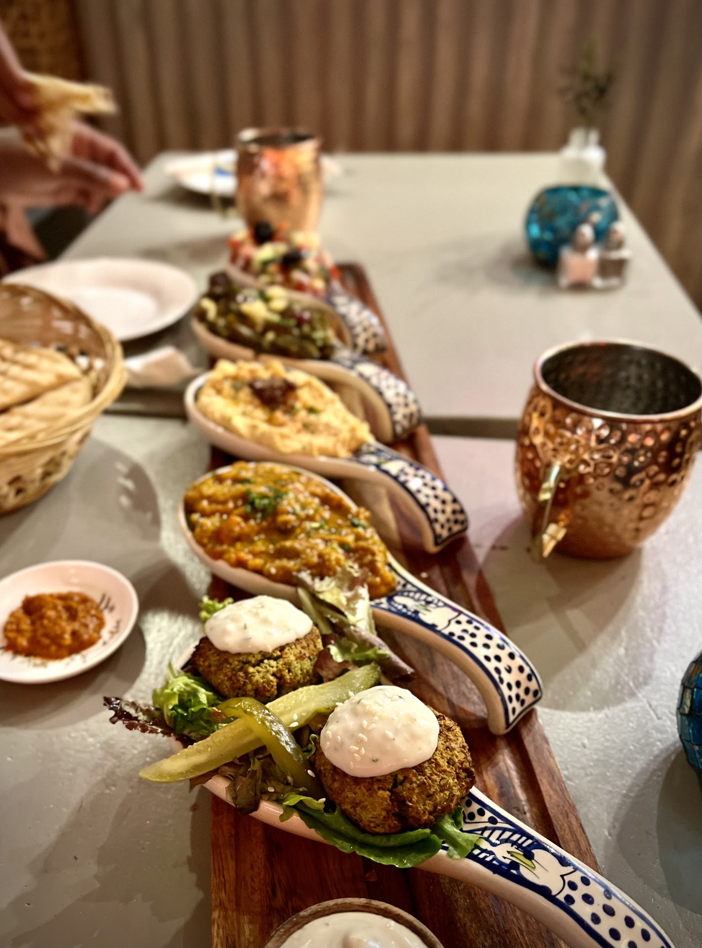 The mezze (sampler) is out of this world. Familiar themes are present (hummus, cucumber salad, felafel) but the nuances are inspired and unique. We couldn't stop exclaiming with delight over the freshness of the food. This panorama of perfectly balanced flavors satisfied my dining companion and me to the point where we worried that we'd ordered too much. But when our chickpea and lentil soup arrived, we were entranced with its comforting, subtle spice profile and its creamy vegan goodness. I had to keep holding the bowl up to my nose so I could revel in its aroma.