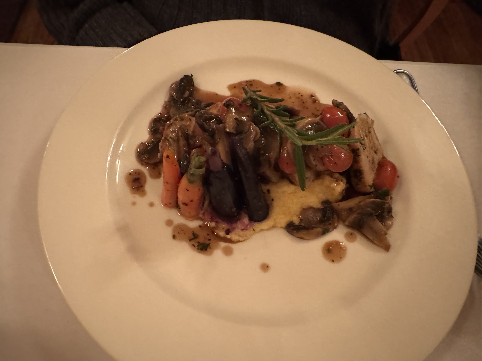 Entrees came about 8-10 minuets after the whole table had finished their appetizers. The sea bass had delicious crispy skin and the Zinfandel beef was tender in a good sauce.