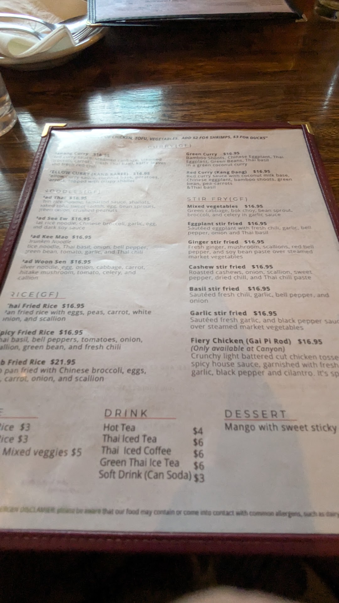 Read moreI had decent food here years ago but tonight was a horrible experience. My 'bar' for Thai in Santa Fe is already low and this was still an epic disappointment. We asked the woman working if all the food we ordered was in the (to go) bag and she said it was. Untrue... -The brown rice we ordered for the curry ($3) was completely left out of the bag but we were still charged. -The Panang chicken curry was flavorful but they gave us shrimp instead of chicken and only four small shrimps in the entire curry order. -Pad See Ew (chicken) was bland, completely flavorless. -Thai Basil Stir Fry. We ordered the veggie option. This dish cost $17 and the tub was 1/3 full. Basically some steamed broccoli and limp cabbage. Less than 8oz of food in some broth and, again, $17! We are taking this back (which I've never done before). -The shrimp rolls were pretty much all tempura batter with mealy, soggy, flavorless shrimp. This fiasco of a meal cost over $90. There are much better options in Santa Fe. We will not...