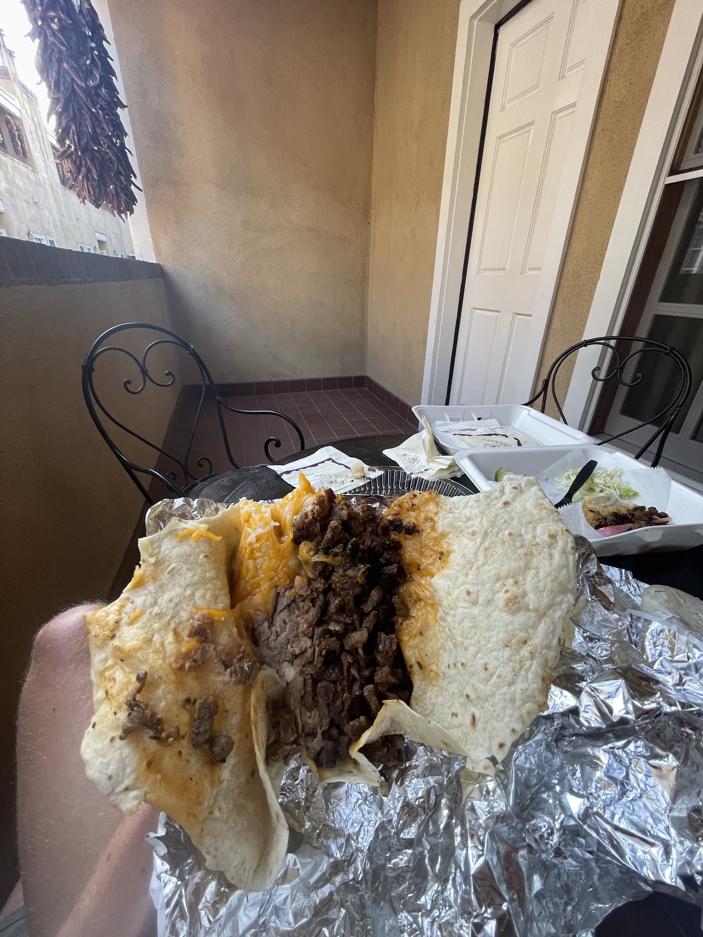 Finally get back with order and my burrito is just meat and cheese and beans. No lettuce. No tomato. No green chili. Meat. And cheese. Wife’s was missing her green chili too.