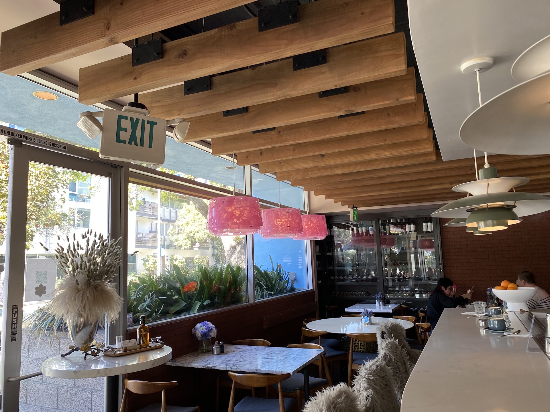 EXQUISITE BREAKFAST ! My wife and I were up in L.A on Wednesday to take care of some personal business. We decided to chill out with an overnight stay at the Marina del Rey Marriott near Venice Beach. On Thursday morning we were up early comparing reviews of good breakfast spots and Blue Daisy on Broadway in Santa Monica was our agreed choice. Rather than check out of our hotel early ( 11am checkout ) we decided to drive over here ( 4 miles ) just before 8am and then scoot back to our room to brush our teeth etc. Sometimes things work out perfectly and we scored a shaded metered parking spot in front of the restaurant. A friendly male staff member asked if we wanted to sit inside or on the sunny outdoor patio....we chose the patio. Within seconds of getting comfortable a friendly food runner named Jorge ( with facial mask ) brought us tall glasses of cool water. We scanned the QR CODE menu with our iPhones and looked for what appealed to us. Before long a server named Marcelo ( also the manager & barista we found out later ) came by to take our breakfast order...2 x DOUBLE SHOT LATTES ( Marcelo said their lattes are usually one shot ) ), 1 x FRESH SQUEEZED ORANGE JUICE for me ( most places tell you it is fresh squeezed but usually it's not ), 1 x 3 EGGS WITH SIDE OF BACON for my wife who asked for scrambled eggs ( zucchini hash, plain crepe with jam ). I was totally intrigued by the original breakfast / brunch menu and decided to try something new to me...1 x ZUCCHINI HASH & POACHED EGGS ( I asked Marcelo to make sure the eggs were hard poached ). My Fresh Squeezed Orange Juice came out first and it certainly had the sweet smell of fresh squeezed orange juice. When I asked Marcelo he flexed his right bicep and said you bet it's fresh squeezed ! Of course it tasted perfectly delicious. And then to our amazement our 2 double shot lattes made their grand entrance. WHAT CAN I SAY....art nouveau style FLAMINGO PINK sculptured cups & saucers with resting spoons. AND TASTE....OMG probably the most incredible lattes we have enjoyed in ages ( made by Marcelo). I asked Marcelo about the coffee they use and he said it is BLACK WIDOW from South America. The restaurant was filling up very quickly and we just knew it was going to be a great experience. Our breakfast dishes arrived together as they should ( not everywhere else ) and looked totally scrumptious. My wife LOVES scrambled eggs whereas I lean towards hard poached eggs most of the time. ZUCCHINI HASH on both of our plates....WOW what an amazing flavor hit ! My hard poached eggs were exactly that...hard poached and they tasted sensational with the sauce provided. My wife loved everything on her plate incl her crispy bacon and the delicate crepe. And we were hoping our rich amazing lattes didn't run out...such rich flavorsome coffee must be savored to the very last drop ! Breakfast is a big deal to us and Blue Daisy resides in the stratosphere with the ABSOLUTE BEST. Thank...