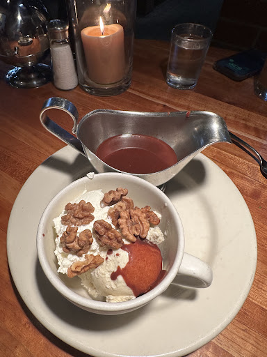 We finished with the brownie a la mode. I liked it a lot, but my girlfriend wasn't a huge fan. The brownie was a standard chocolate fudge brownie with nuts but also raisins I think topped with French vanilla ice cream with espresso chips. It was a few interesting flavors in one but I thought it worked!