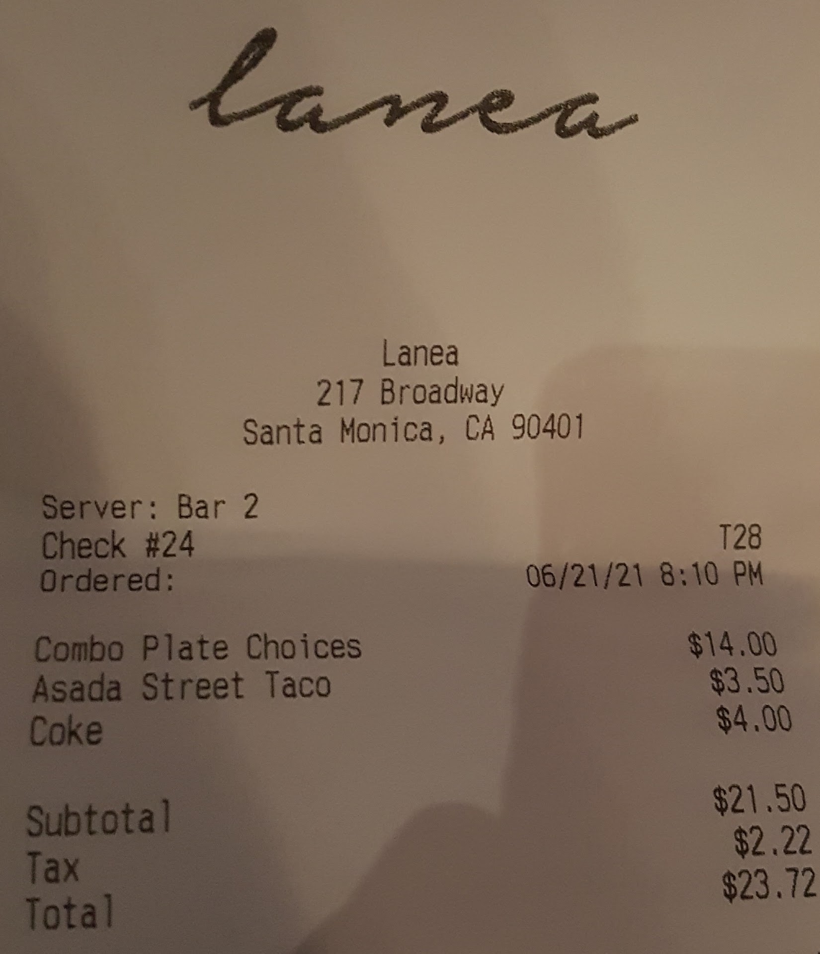 Read moreAfter watching the sunset from Venice beach, my friends and I were looking for a place that was open late for dinner. We randomly stumbled upon Lanea on our way to the third street promenade. Not only were the food and drinks delicious (I recommend the picante coast highway margarita and the WATERMELON. SUGAR. HIGH. for drinks--the margarita flight was also very fun--and quesadilla for food), the bartenders were some of the nicest people I've met. The bar was packed and only two bartenders were there to take orders and make drinks. Both Alie and Chad were amazing. They took my order and quickly made the drinks (which were delicious) and then brought our food to a table outside, even though the bar area was packed. They were quick to take our order, quick to serve us, and quick to smile during the whole process. The two handled the stress phenomenally, and I could go on for pages about how great they are. As I said, Alie and Chad are the best bartenders I've ever met; they're great at making drinks and even greater at making me want to come back. The flight of margaritas made it a fun night, but the bartenders...