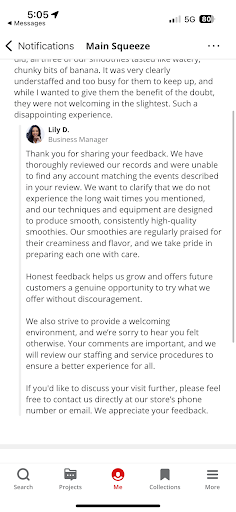 0/5 experience would never come back, go support the smoothie place out front of Golds Venice, good people, hard workers. Smoothie is done in minutes tastes way better than this. Sorry main squeeze,...