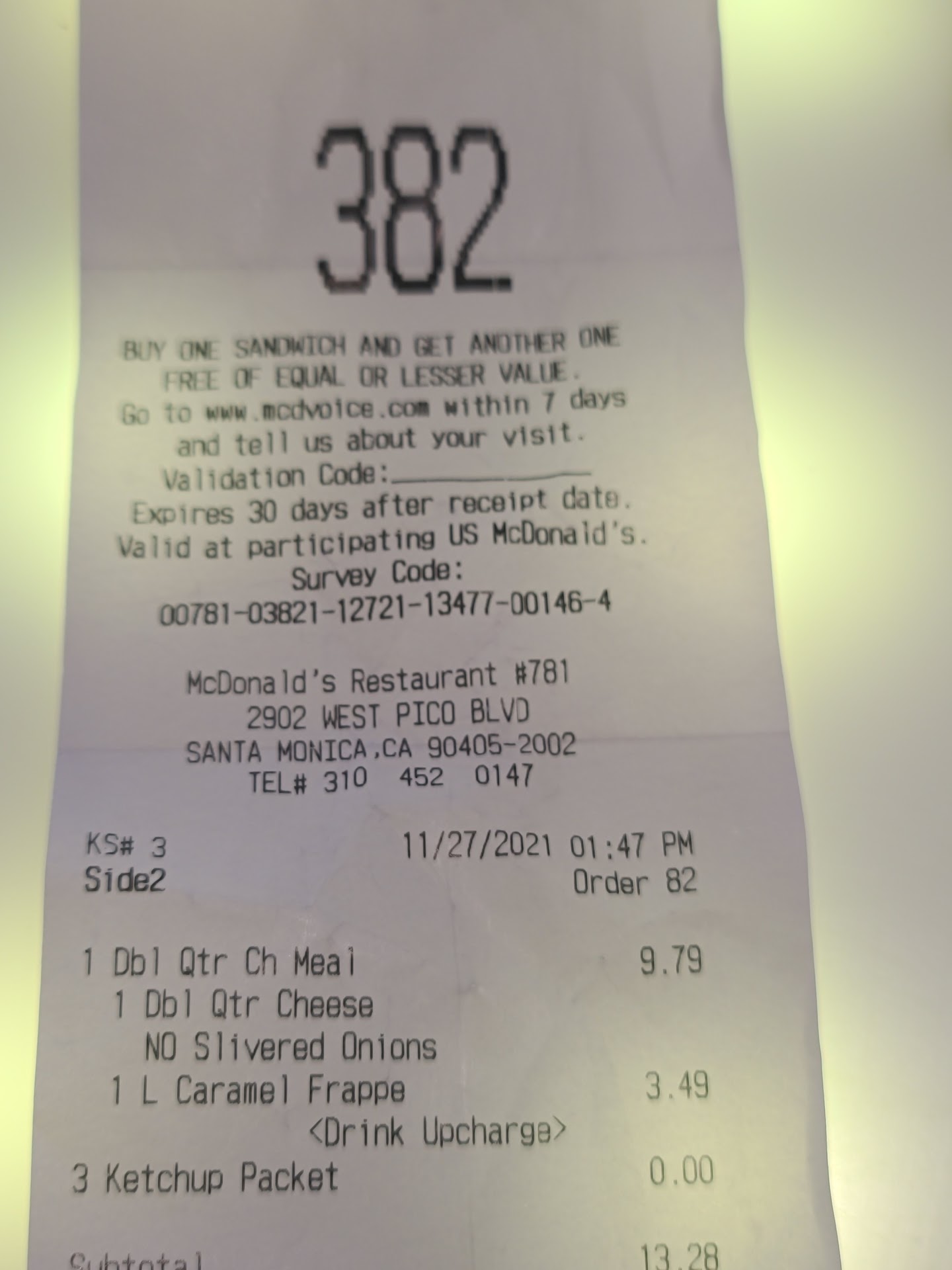 This problem never happens at the McDonalds on the corner of Hill St and Lincoln, this never happens at the McDonalds on the corner of Santa Monica Blvd and Princeton. This is the only McDonalds that has this problem and it is EVERY VISIT.