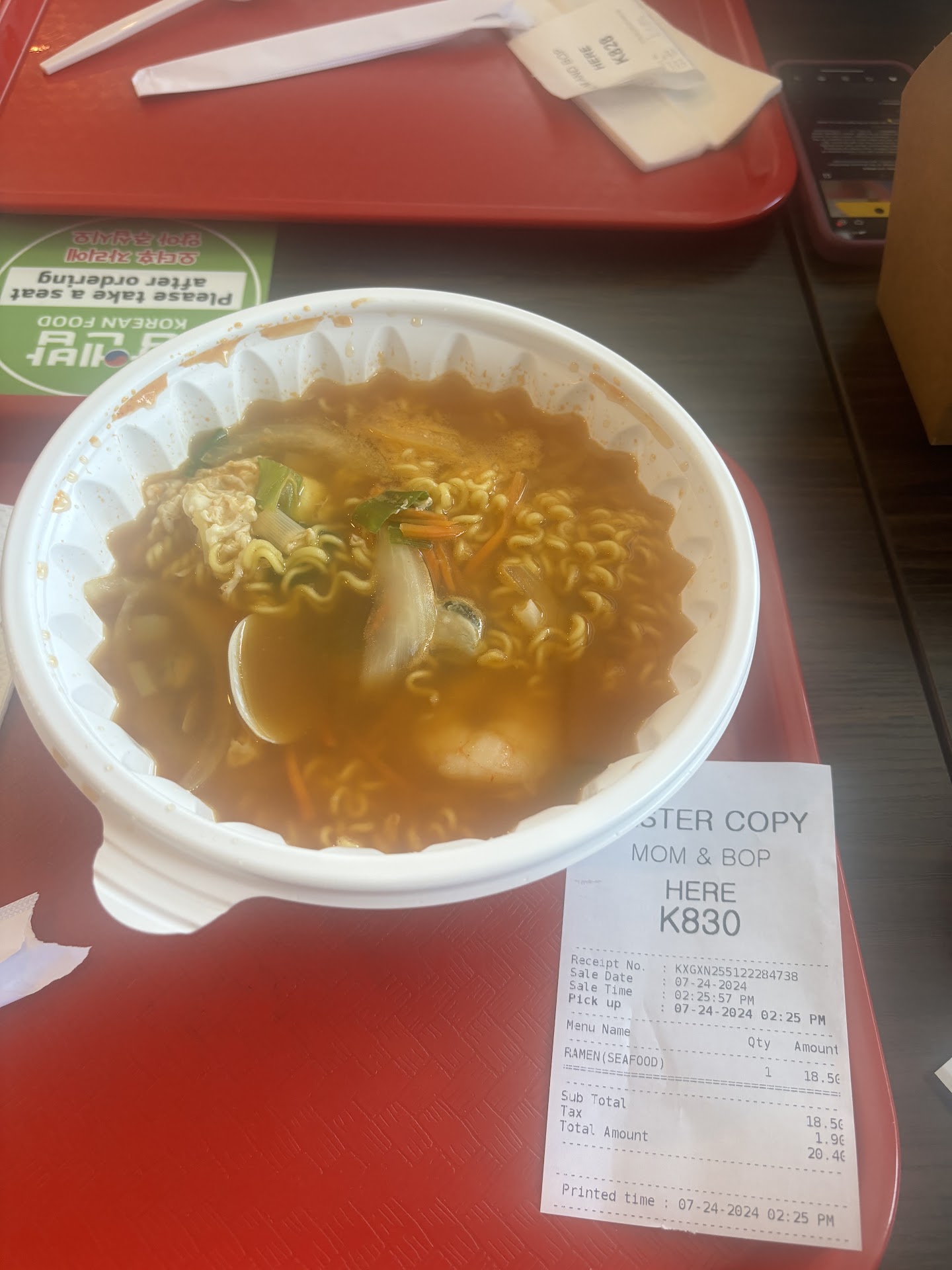 My one Star reduction was for the restaurant operations. Despite signs saying Order Here at the counter, you must order online or at a kiosk that I found rather clunky and required constant multiple key-presses to work. The kiosk was out of paper and unable to print a receipt. I found the tables and seating to be rather dirty and stained. Yes, there are signs around asking you to clean up after yourself, which I was happy to do, but eating a slurpy soup is bound to splatter all over, no matter how careful you are. I wiped up after myself with the few paper napkins given, but the table was stained nonetheless, by myself and previous dinners.