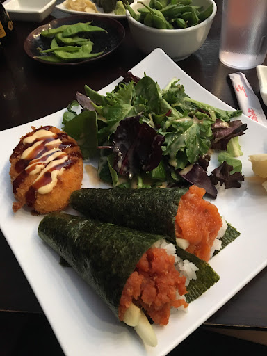 Read moreSushi spot with lunch specials close to the metro stop. Came here on a Thursday for lunch with a coworker around 11:30am. There were two other tables occupied when we got there but it was pretty empty (all indoor seating). We split some edamame and ordered from the lunch special menu. I got the 2 P.C. hand roll combination which also came with miso soup, salad, and a croquette. I liked the croquette more than I thought I would - it came piping hot and had a soft, creamy middle. The miso soup was also good and not too salty. For the hand rolls, I got the spicy tuna and the salmon. They were pretty generous with the fish portion provided. The seaweed got a bit soggy but the rice to fish ratio was good. I preferred the salmon over the spicy tuna. They let you split the bill with and take credit cards. Street parking is hard so park in the...