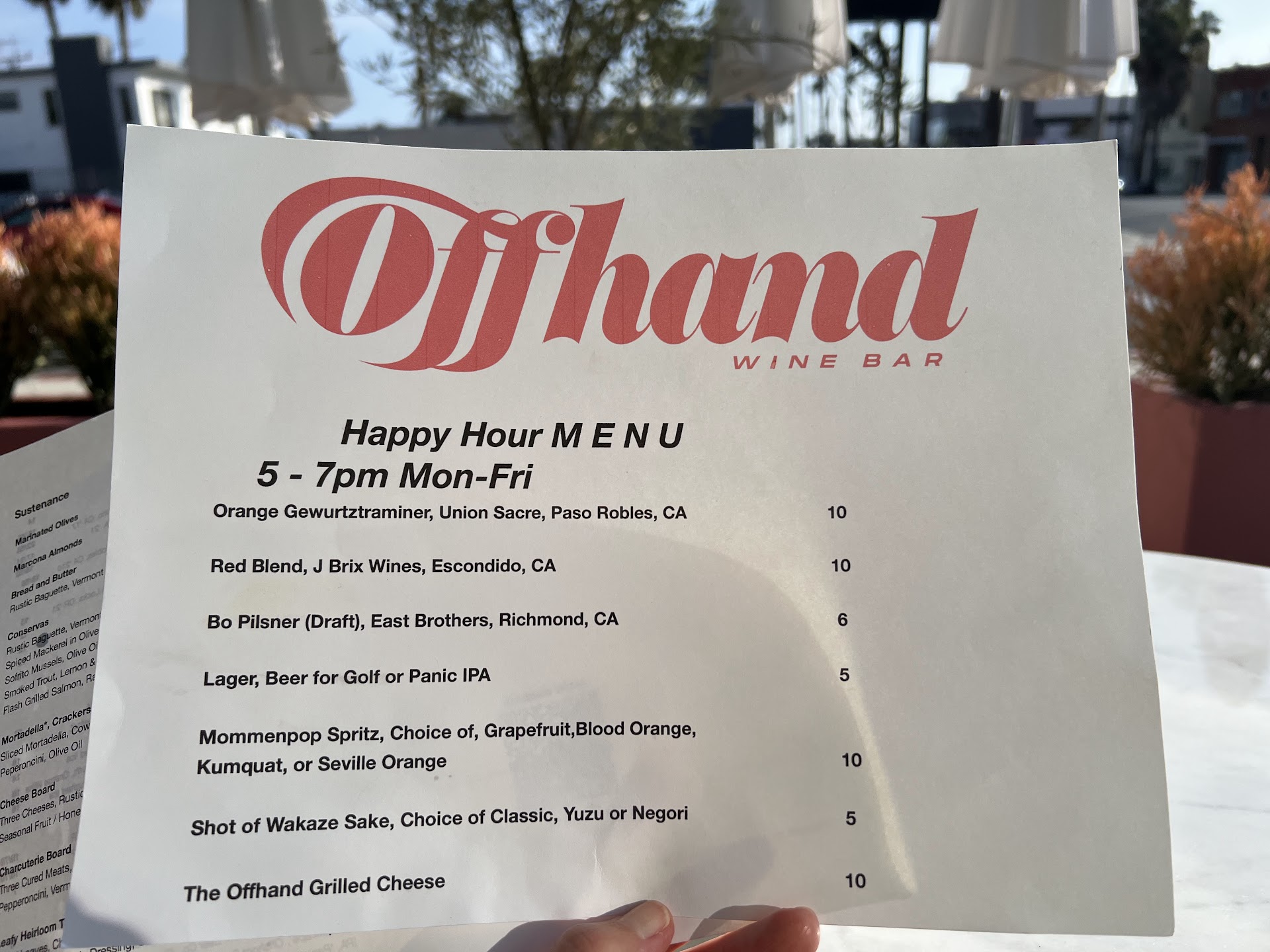 Read moreOffhand Wine Bar is a hip hangout with inviting space and a trendy vibe. It's hard to miss that they have more merch options than wine options. The wine list is made up of almost entirely CA "natty" wine, with the exception of two OR offerings. I was surprised when I asked a bartender about some wine options, and he didn't seem to know much about them - I appreciate his honesty, but maybe don't expect sommelier-type guidance while ordering. It's a fun spot but it lacks the breadth and depth I seek from a wine...