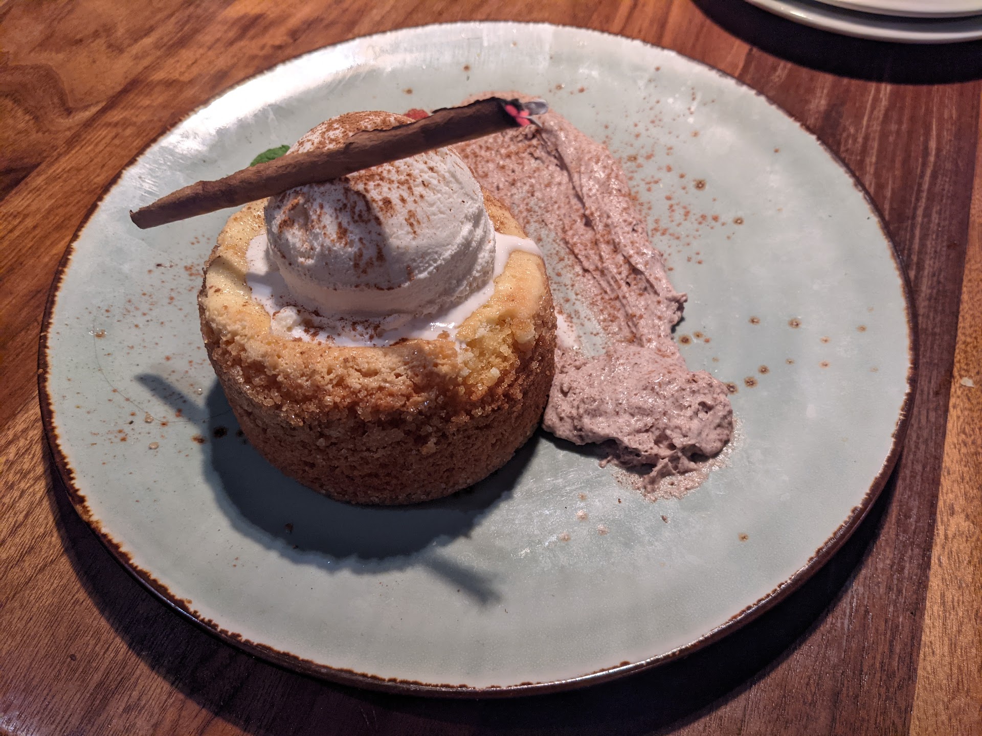 The bar cleared out just after 9:30 p.m. and as I debated dessert I looked around and saw a handful of tables still there, so we decided to go for it. We saved just enough room to split the butter cake, which was divine! A note on the presentation: it arrived with a burning incense stick laying atop the vanilla ice cream, which was an interesting touch. The cake was the perfect consistency, not too dense or crumbly. The chocolate mousse was a fine complement, not overpoweringly sweet. Next time I think I'll ask for the vanilla ice cream on the side though.