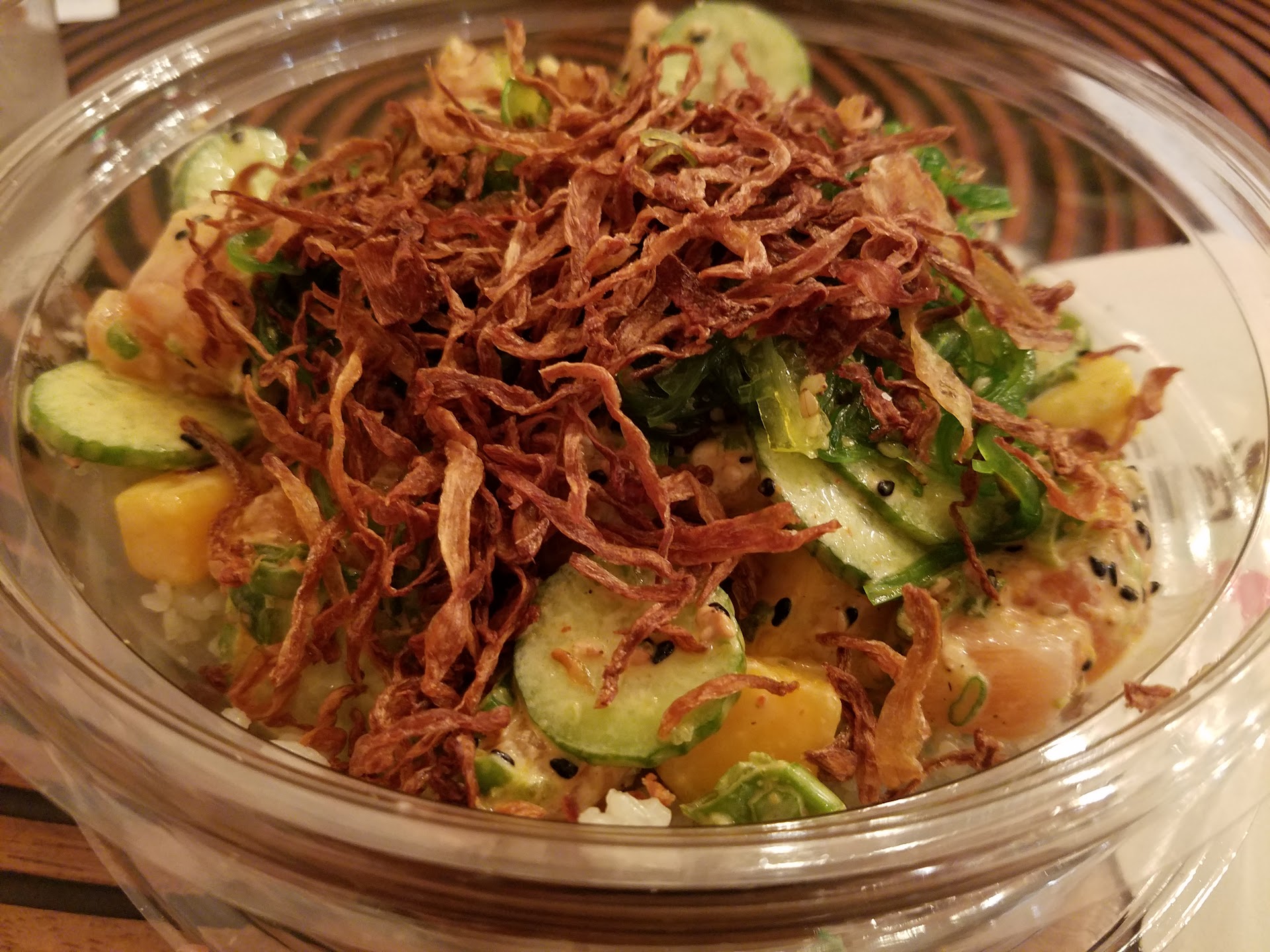 I got the Sriracha Tuna bowl with bamboo rice, and added crispy onions plus pickled ginger. I was disappointed with the portion size for the price, compared to other Poke restaurants I've been too. (Poke Bar in West Hollywood, for example, serves HUGE portions and is also very generous with the side orders.)