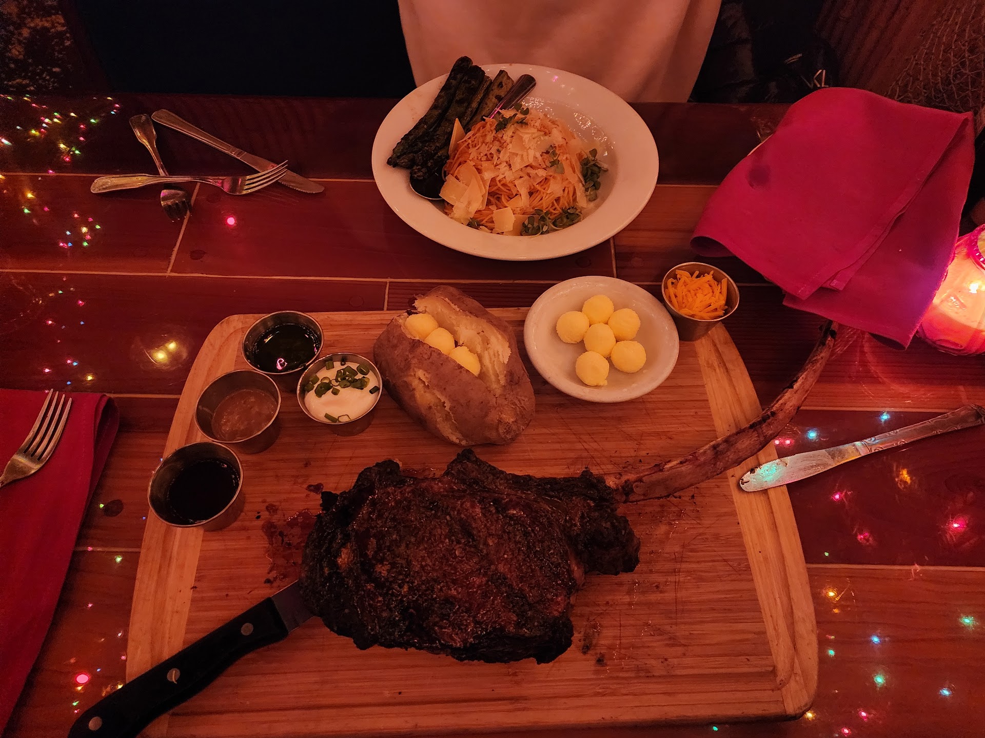 It was my birthday the day before but we celebrated the next night at the Galley. Everything was EXCELLENT, I'm talking 5* fine dining excellent without the 5* price tag. We ordered the clam chowder (I'm from Boston so I'm very picky about my clam chowder, and I am going to order it again next visit), full wedge Caesar, garlic bread, veggie pasta for my fiancé (she's vegetarian) and I had the 40oz tomahawk medium rare with asparagus and loaded baked potato. Again everything was DELICIOUS and fresh made to order. The asparagus was surprisingly grilled to perfection, most places overcook or undercook it always but theirs was perfect. And the Tomahawk.... Just WOW. My 2 favorite places to go for Tomahawk steaks in the Santa Monica area where we live are BOA Steakhouse and Mastro's Ocean Club, but let me tell you, the Galley's just may have been better (and much more affordable). We used to go to BOA like once a month after a great work week, but I think we're going to be frequenting the Galley weekly now just for this Tomahawk. Words can't describe how good it was, I had dreams about it after haha. It was perfectly seared, perfectly seasoned, and the temperature was spot on MEDIUM RARE. I can't tell you how many restaurants overcook medium rare and bring me a medium or well done, but the Galley nailed my favorite medium rare. 5 stars!