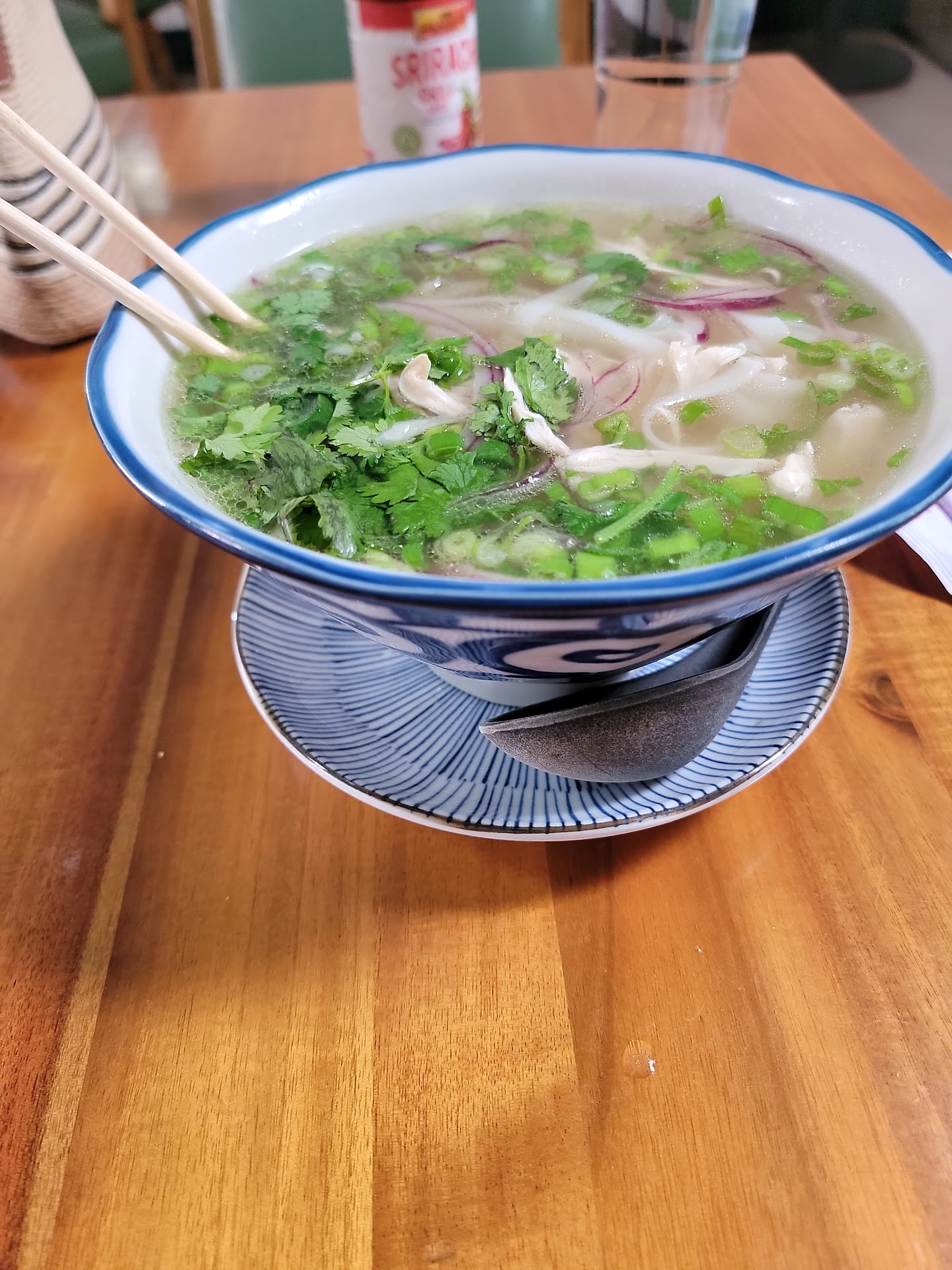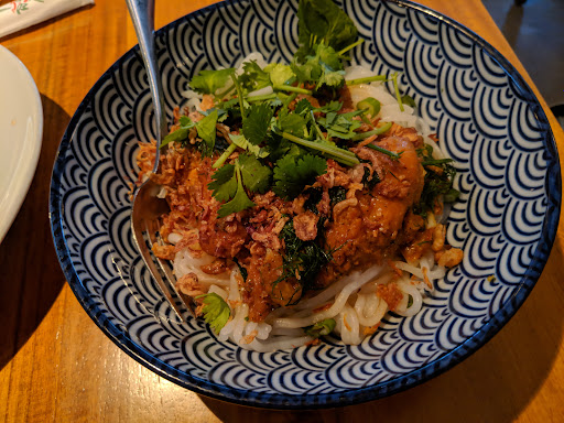 Our party of three was exhausted from a long drive, and since this was almost across the street from our hotel, we decided to make a very early night of it and eat there. 4:45 pm, restaurant was pretty deserted - super clean, waiter masked, lighting ambient but enough for the oldest among us to read the menu easily. Our waiter was great. Helpful, knowledgeable, funny in a charming way (not overdoing it to being annoying). He was there when we needed him and stayed away otherwise. One thing I particularly liked was that he waited until one of us had finished speaking before asking if we needed anything else. The vegan pho was excellent; tons of vegetables, good broth. The jicama fresh rolls appetizer, also excellent - and I don't know what they do with their peanut sauce but it was head and shoulders above what most Vietnamese restaurants serve. I had Pho Ga (chicken), which is often hard to find. The broth could have used a bit more anise and been a little stronger over-all, but otherwise it was very good. Chicken was clean-tasting, without that undercurrent of really cheap meat you sometimes get in soups. I asked for extra vegetables and got a heaping platter of bean sprouts and basil on the side - no charge. Ginger tea was slightly sweet, delicious, as was the jasmine tea. If I had one criticism, it would be that the noodles, which were flat, were over-cooked. Another few minutes and they'd be falling apart. However, all in all I'd highly recommend this. No, you're not going to get "Omigod this is the best pho ever". You are going to get a good, filling meal that will leave you...