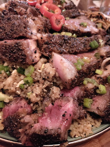 Ditto for the ribeye, which was a 31 ounce monster that we shared. The brisket was cooked perfectly - rare the way we requested, and the dry rub was delicious. The ribeye came with Asian style fried rice and sesame seed chow mein noodles. It was a delicious twist on standard BBQ sides.