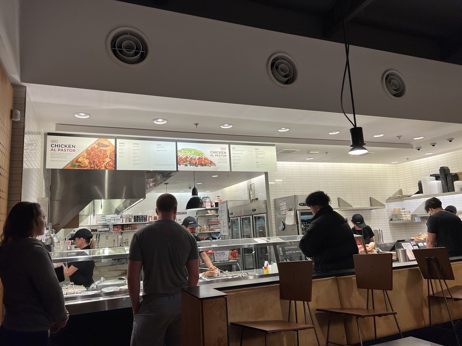 2nd observation, same visit, saw employee knock over small stack of about 8 or 9 medium sized to go containers, maybe for beans or rice. The stacked to go bowls hit the dirty floor behind the line, to right of the register if you’re facing the register, where the online / food delivery section is. That 1st Employee made no attempt to pick them up and toss them out. 2nd employee packing up a Uber eats order slightly kicked the stack of bowls a few inches (they rolled), allowing more dirty floor funk to accumulate on the still “stacked” bowls, 3rd employee noticed stack of bowls on the dirty food-line floor and picked them up and put them back on the shelf for to go use…. Yum