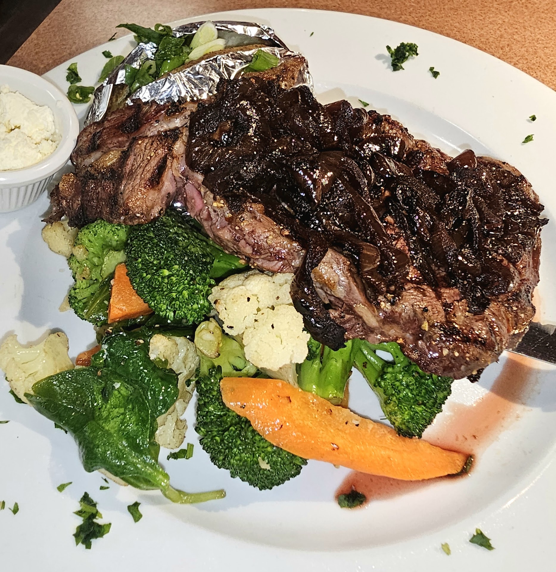 Santa Rosa was having the "Rose Parade" earlier in the day, so I was lucky and it was not busy when I stopped for dinner. I got to chat with the friendly Waiter and learned that my excellent salad had been prepared when it was requested, which was why it was BEAUTIFUL and crisp and without a single brown edge or whilted leaf. There wasn't a bite that was bitter. Both the greens and dressing tasted great. I had no croutons on my salad, due to a cheese allergy and excessive caution. My entrée was also freshly prepared and the vegtables were so good I could gave eaten a whole plate of just veggies. The Waiter said that the veggies were not cooked in advance, but done when ordered . . .and you could tell. Each vegtable had its own unique flavor, sautéed in garlic butter, instead of just tasting like "mixed vegtables". Delicious! The Ribeye steak was cooked perfectly. It was a generous piece with VERY little waste. My Ribeye in the menu description noted a basalmic onion and blue cheese reduction on top, but again, mine had to be cooked without the Blue Cheese due to a cheese allergy. I asked for it medium rare and that was how I got it. My baked potato came with chives and butter only, because I did not want the sour cream that was offered on the menu.