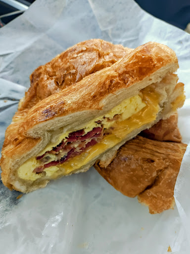 Ordered a ham,egg and cheese on a croissant and a Thai ice tea w bobba ! Both very satisfying !! Sandwich had flavor and cheese melted all the way, buttery flaky croissant . Yumm!! Thai ice tea was nice and tall, not overfilled with ice! Service was proper, will be back on a weekend to try some donuts as they looked amazing, i did not grab any as they would not make it home if i had grabbed em...