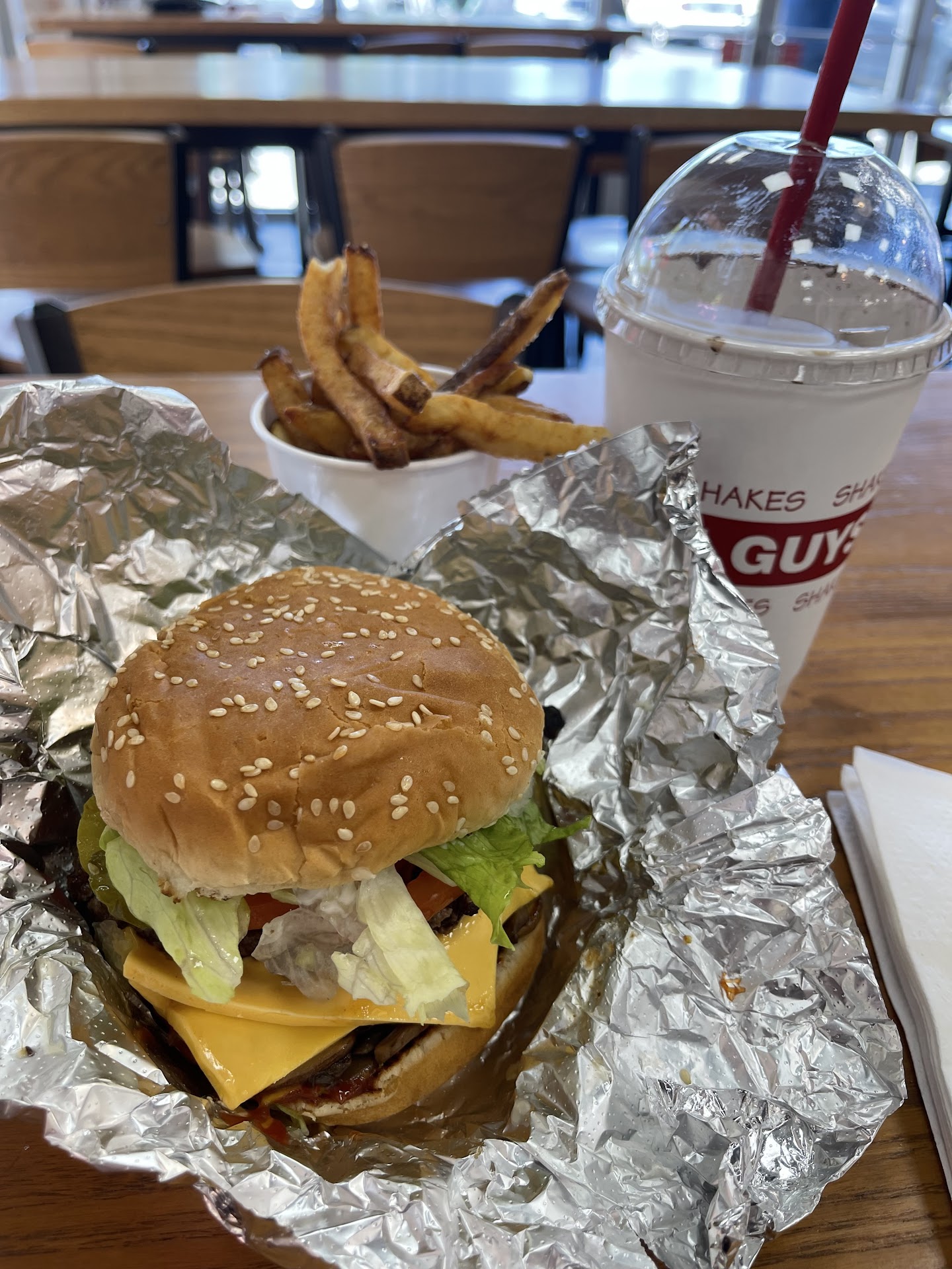 I drove past five good taco joints and a pizza place because I wanted a burger and some clown posted a good review the rat. I will never, ever, set foot in a Five Guys burger...