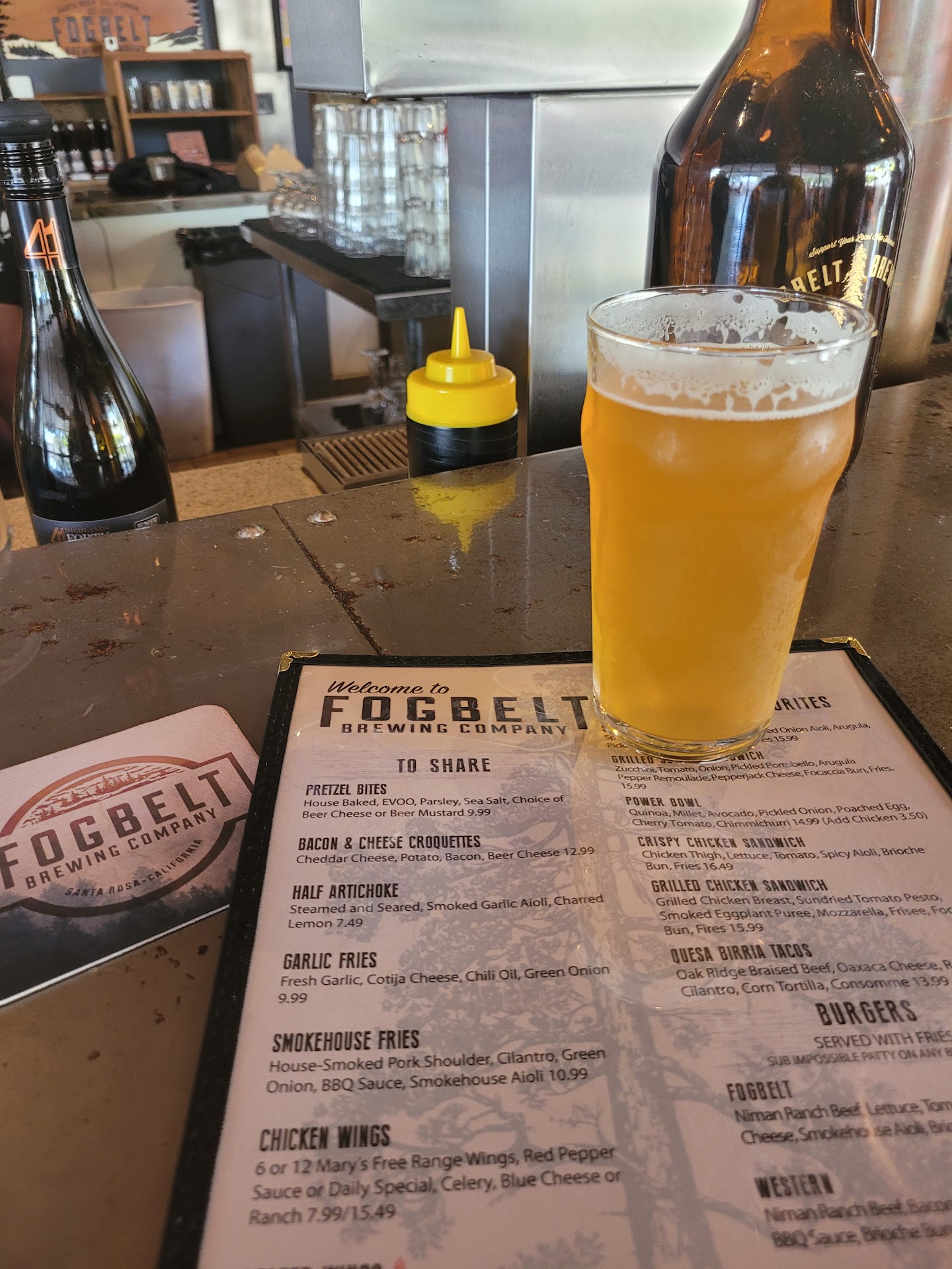 Fogbelt has both inside and outside seating, as well as barstool seating along the main bar. The covered outside seating has about five large tables, as well as space heaters mounted along the ceiling making seating comfortable when the weather is cold. They do offer high chairs for younger kids.