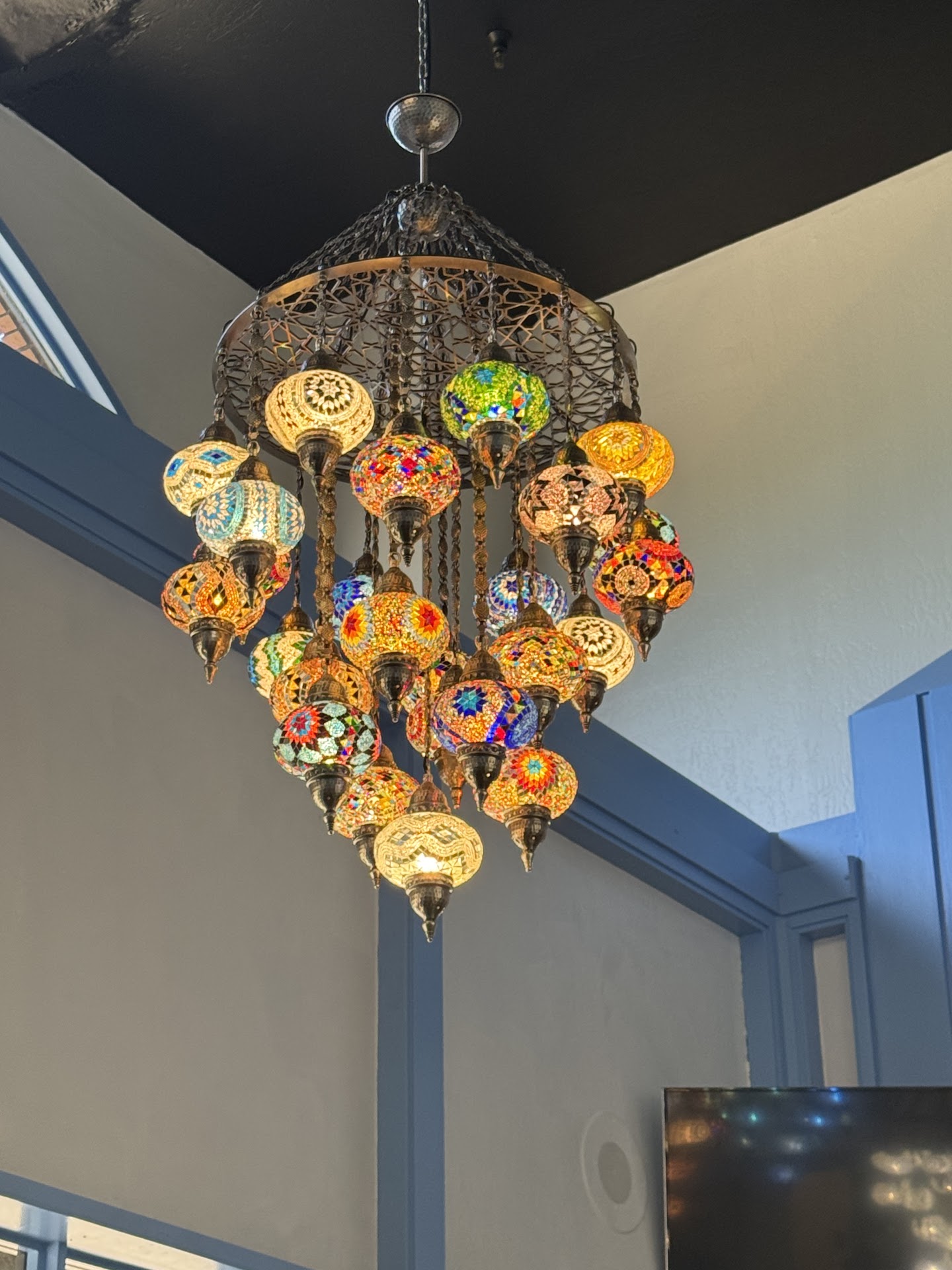 At first glance, the restaurant may seem modest from the outside, but step in and you’ll be transported to what feels like a cozy corner of Istanbul. The interior is stunning, with traditional Turkish hanging lights, blue-painted walls, and white chairs that perfectly complement the Mediterranean theme. The space features a high ceiling that lets in plenty of natural light, creating a bright and welcoming dining atmosphere. TVs display scenic views of Turkey, and artwork on the walls adds to the authentic feel. There’s also a bar area offering wines and beers for a relaxed evening.
