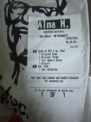 My party and I had ordered the $20 KFC meal. This came with 6 pieces of chicken, 4 sides of your choice, and 4 biscuits. The sides we had ordered was Mac n cheese, mashed potatoes with gravy, fries, and coleslaw.