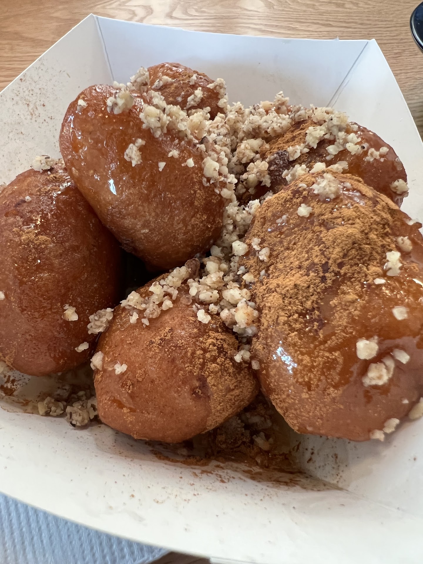Came to this restaurant after work and was delighted to see an enormous arch of blue and white balloons at the entrance. Walking up close I heard the familiar sound of Greek music from inside. Door opens what do I see people on either side eating, smiling, and laughing. Having a great time, without hesitation I had my order pre loaded and ready? Lamb gyro and Lukumades! Sat down bobbing my head to the music and before I knew it Gyro encompassing half , yes HALF!!! of the basket and the rest Nick’s Fries what a glorious sight to see, I wasted no time and on first bite I felt like I was in Greece again so authentic, so perfect to the taste. Like a kid in a candy store, for that moment a gyro fueled wave of euphoria washed over my entire soul. I couldn’t tell you what the text 5 minutes was like I was lost in this flavor storm and came to when it was consumed. Picture of the perfect presentation of the Pita is not included because I thought of it after the fact However I can bless you with this image of what can only be described as Midas’s Lukumades. Golden Grecian style doughnut holes,glistened and boiled and drizzled with honey of the gods and dashed with cinnamon and crushed nuts over the top. At that moment Bob Ross could have painted a Happy little Greek on his canvases. This Food is so good I can not rave enough about...
